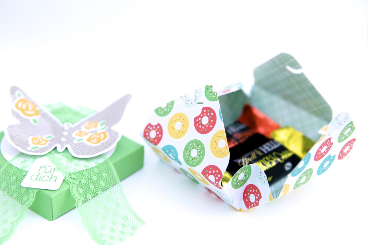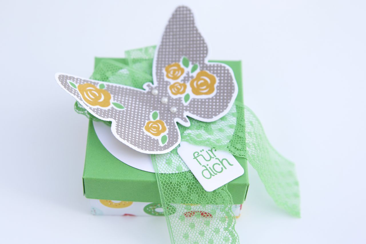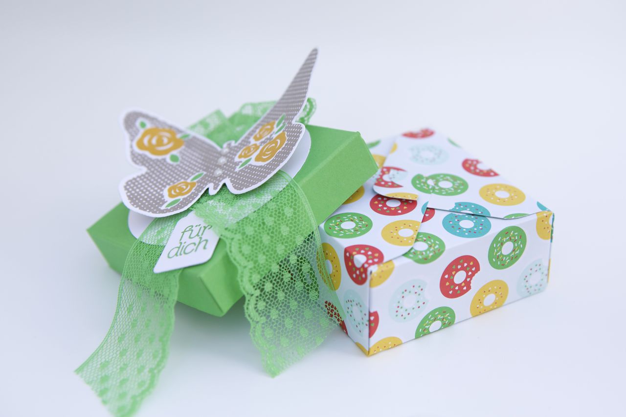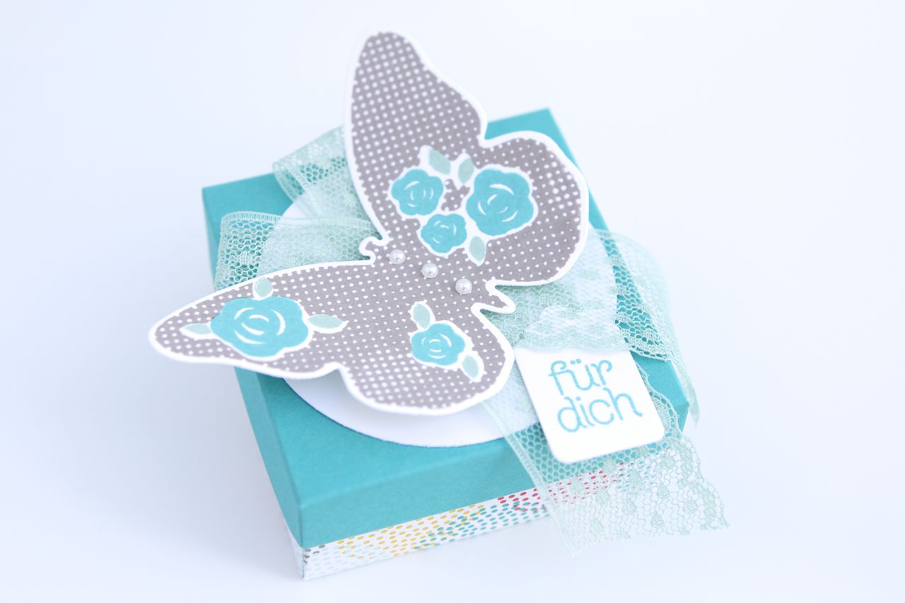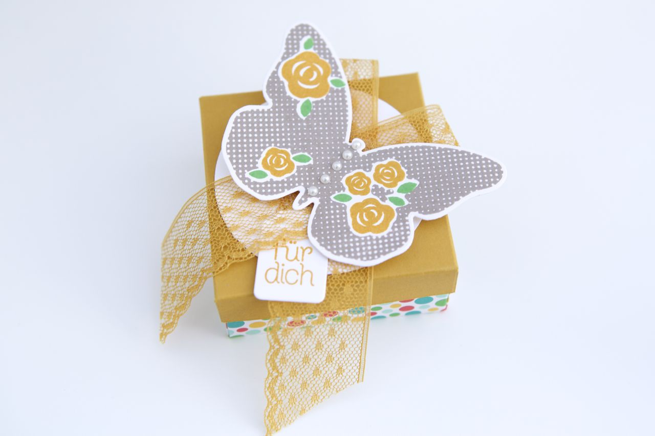 Die Verpackung selbst habe ich mit dem Stanz- und Falzbrett für Geschenkschachteln erstellt. Mittlerweile führt Stampin Up! ja drei verschiedene Falzbretter. Eins für Umschläge – das ist für mich ein Must-have, da kann man schnell einen Umschlag für jede benötigte Kartengröße herstellen. Dann gibt es ein neues Stanz- und Falzbrett für Geschenktüten – ist auch nett, die kann man aber auch gut nur z.B. mit dem Papierschneider von Stampin Up! (auch ein Must-have) herstellen.