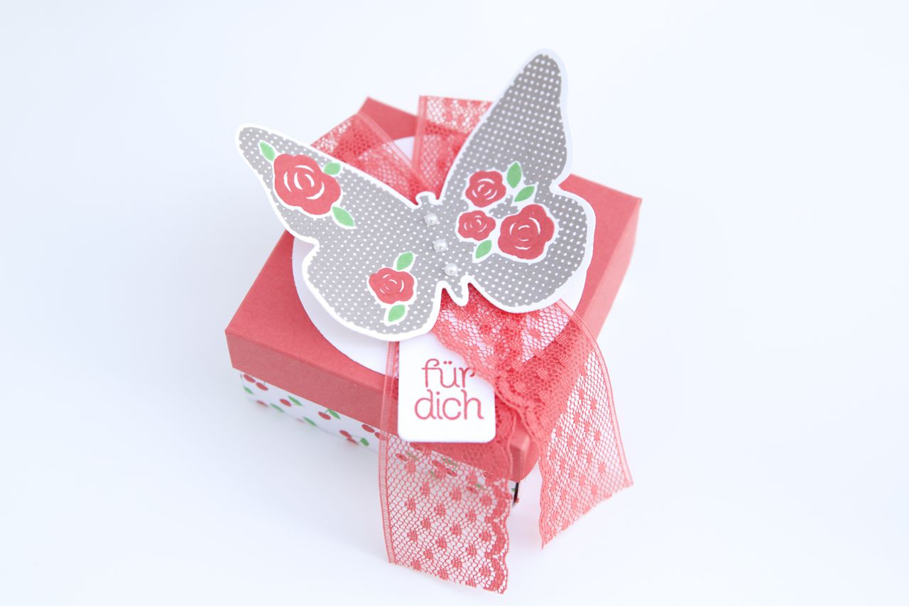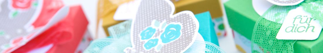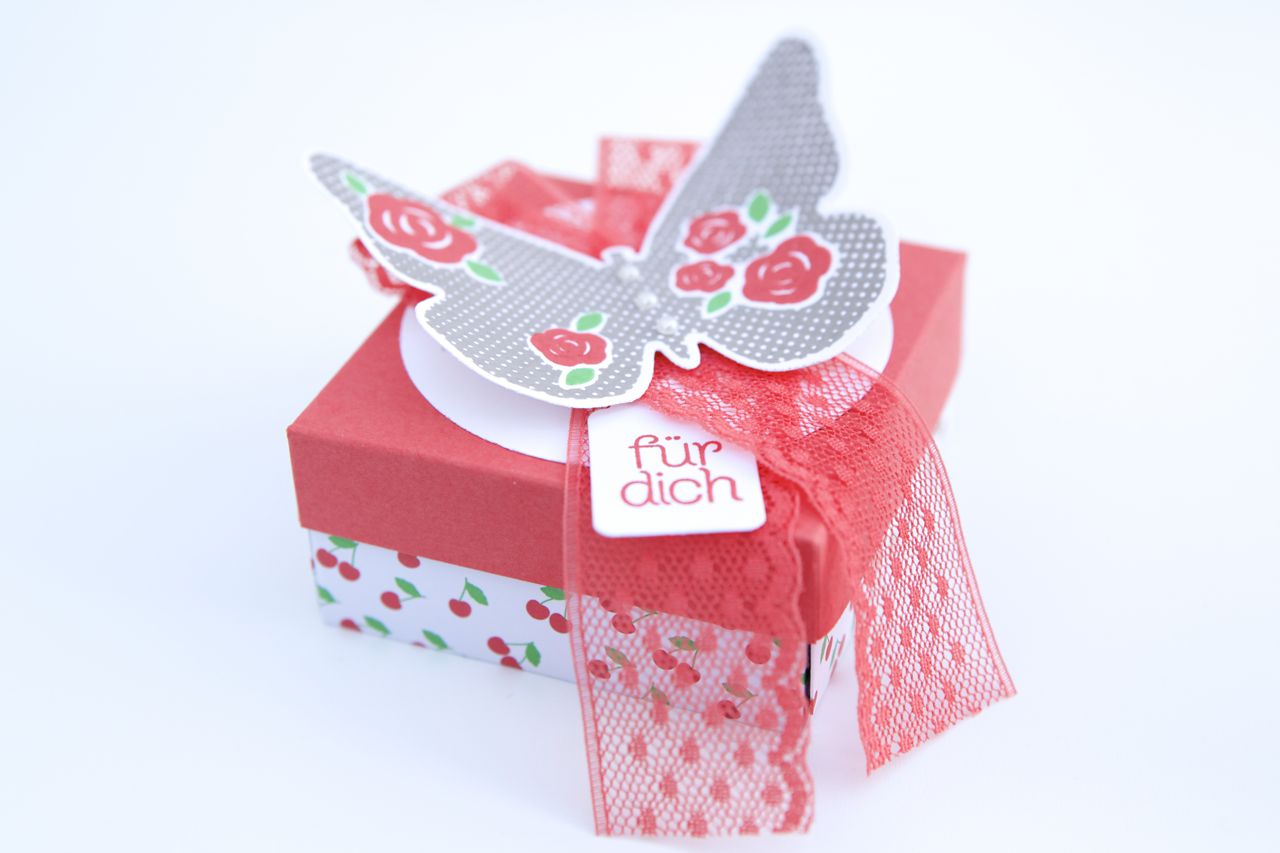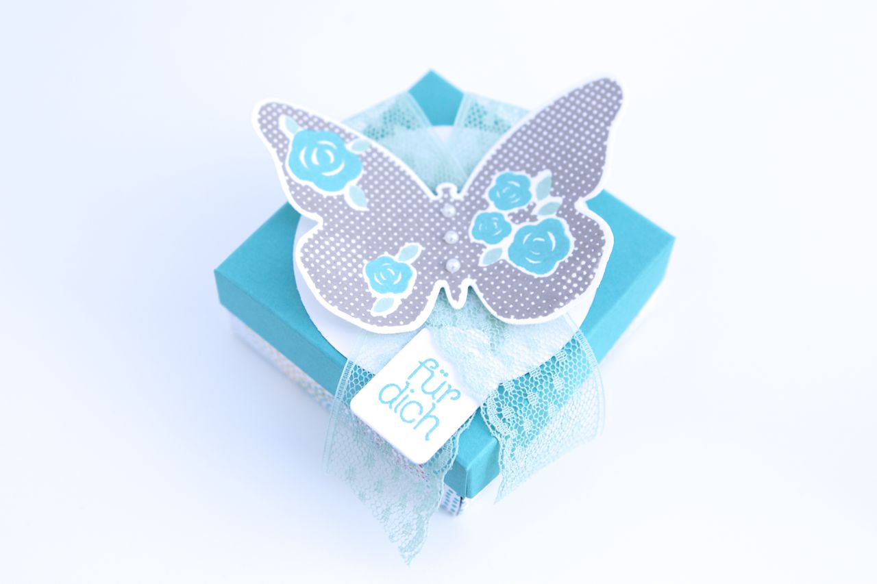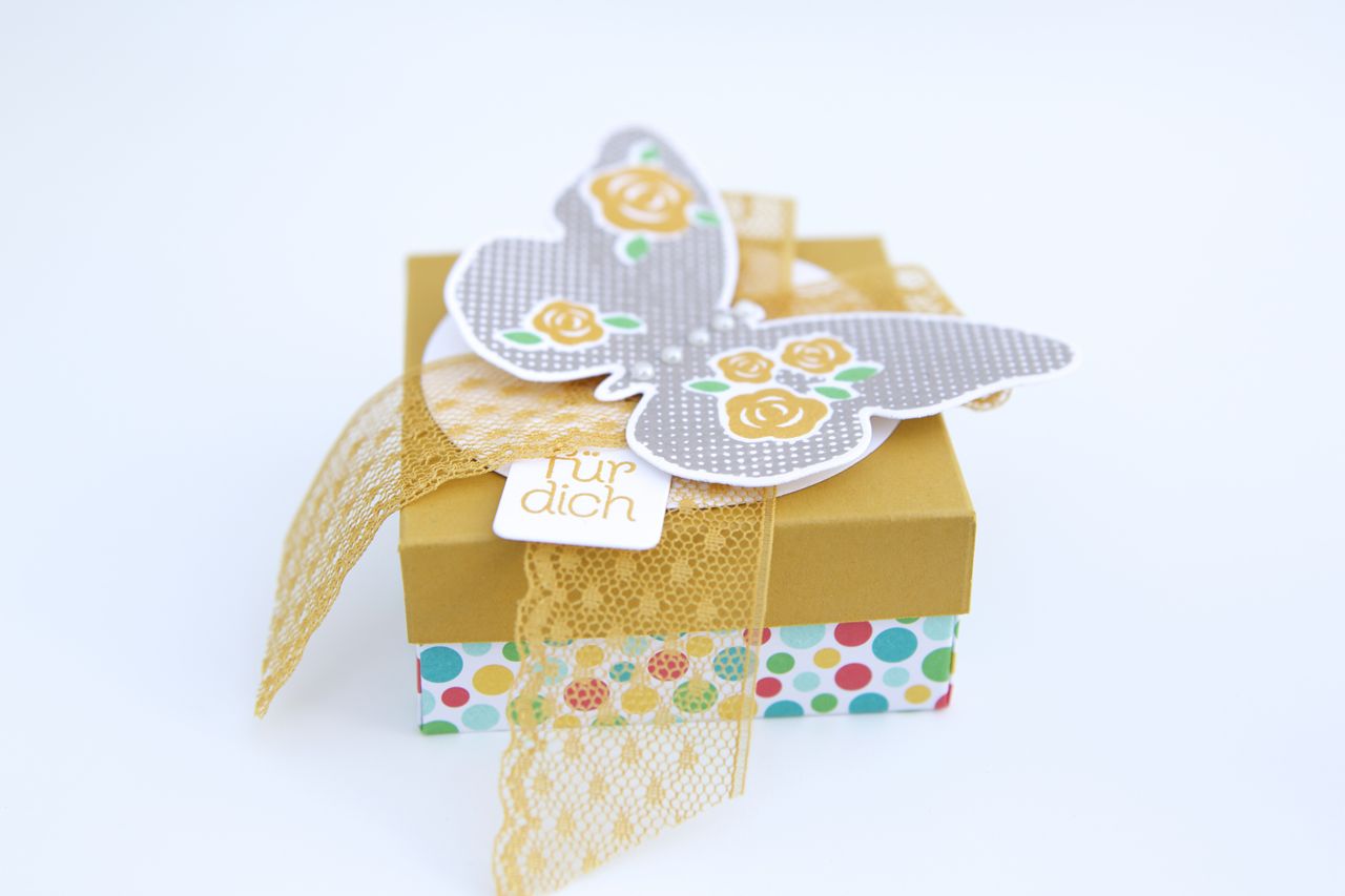 Die Verpackung selbst habe ich mit dem Stanz- und Falzbrett für Geschenkschachteln erstellt. Mittlerweile führt Stampin Up! ja drei verschiedene Falzbretter. Eins für Umschläge – das ist für mich ein Must-have, da kann man schnell einen Umschlag für jede benötigte Kartengröße herstellen. Dann gibt es ein neues Stanz- und Falzbrett für Geschenktüten – ist auch nett, die kann man aber auch gut nur z.B. mit dem Papierschneider von Stampin Up! (auch ein Must-have) herstellen.