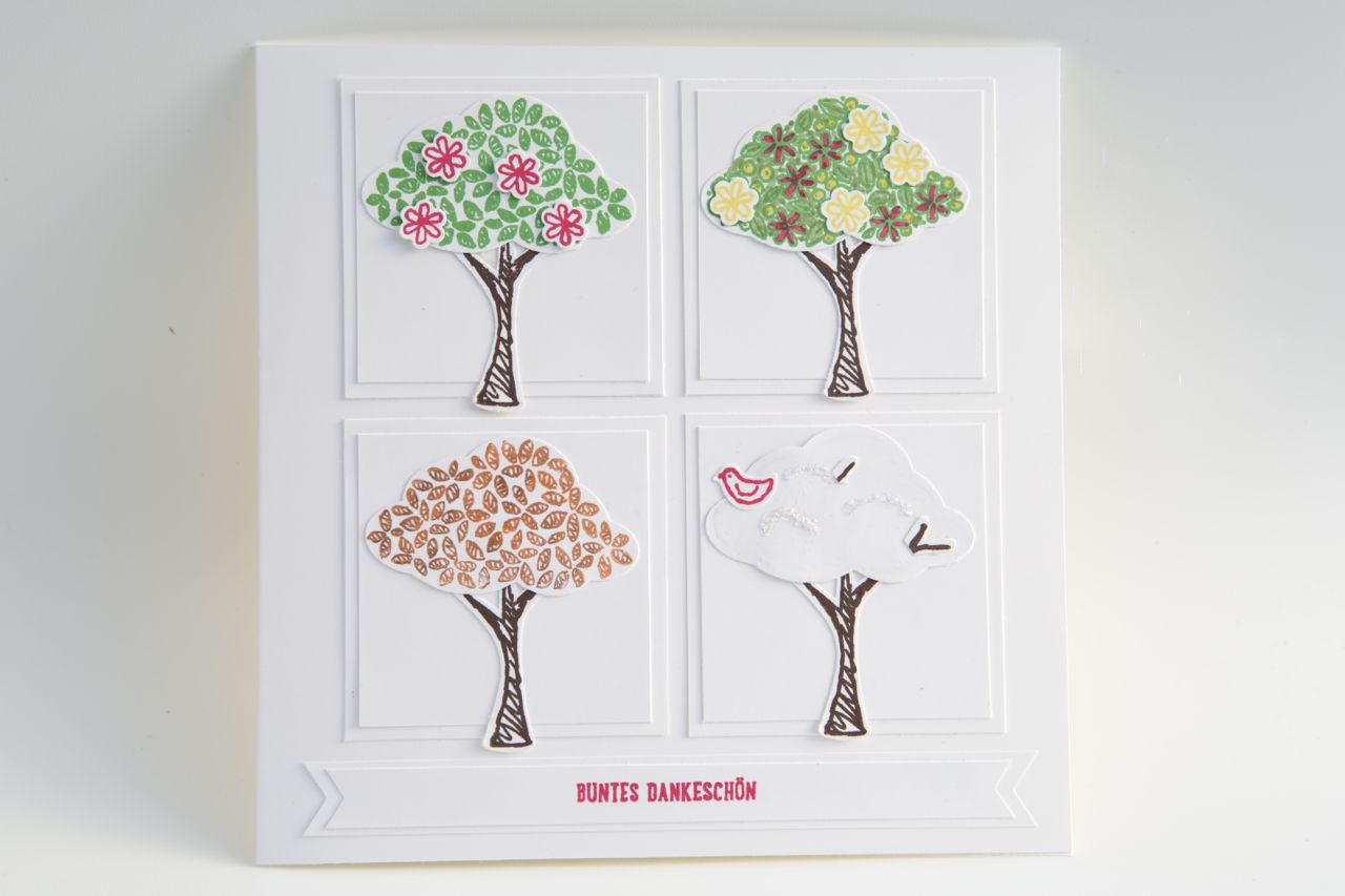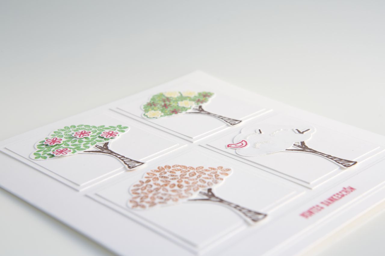 Ich habe mich zu einer vorwiegend weißen Karte entschieden, deren einzige Farbelemente der Baum zu verschiedenen Jahreszeiten ist. Ich hoffe, sie gefällt euch. Bei Fragen einfach melden.