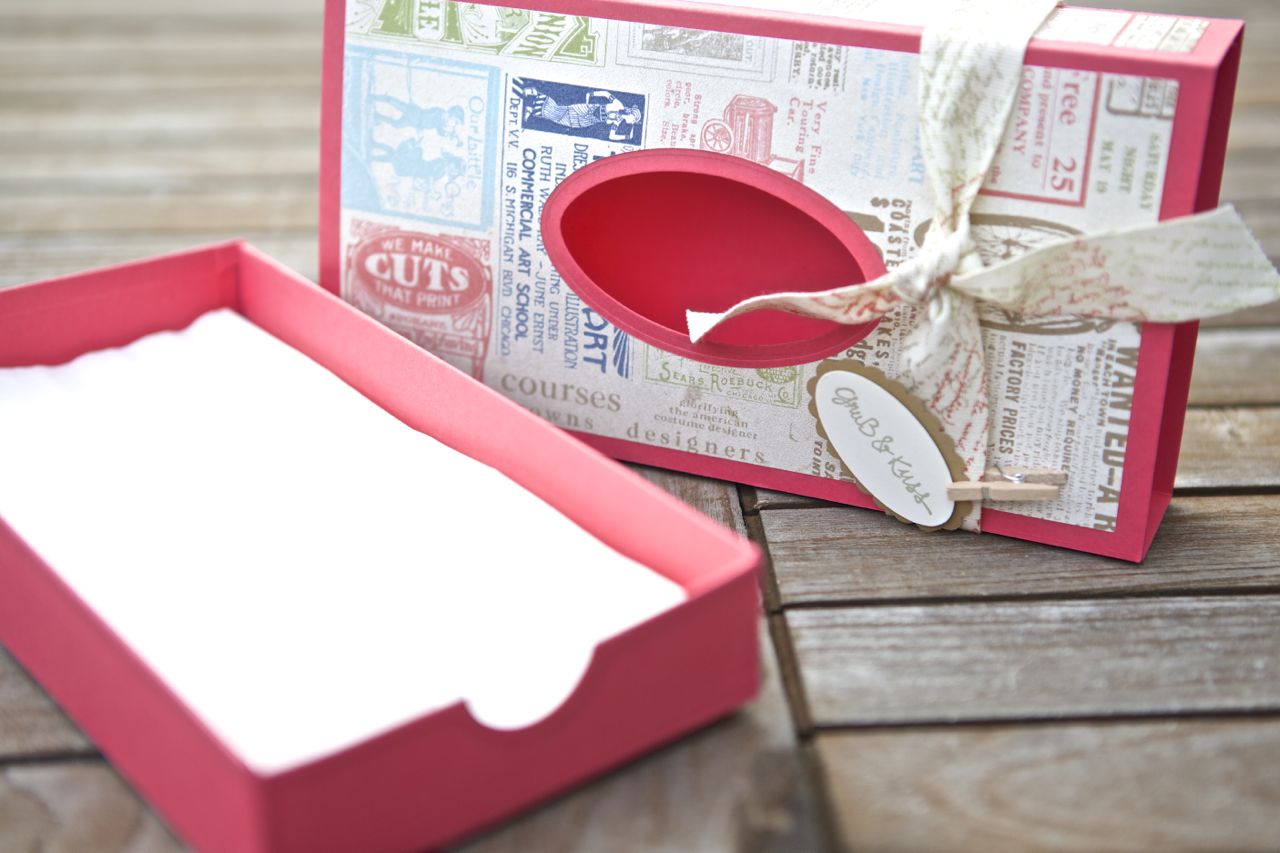 Das Loch zum herausziehen der Kleenex habe ich mit den ovalen Framelits gemacht. Für eine Handstanze ist das Loch zu weit vom Rand entfernt 😉