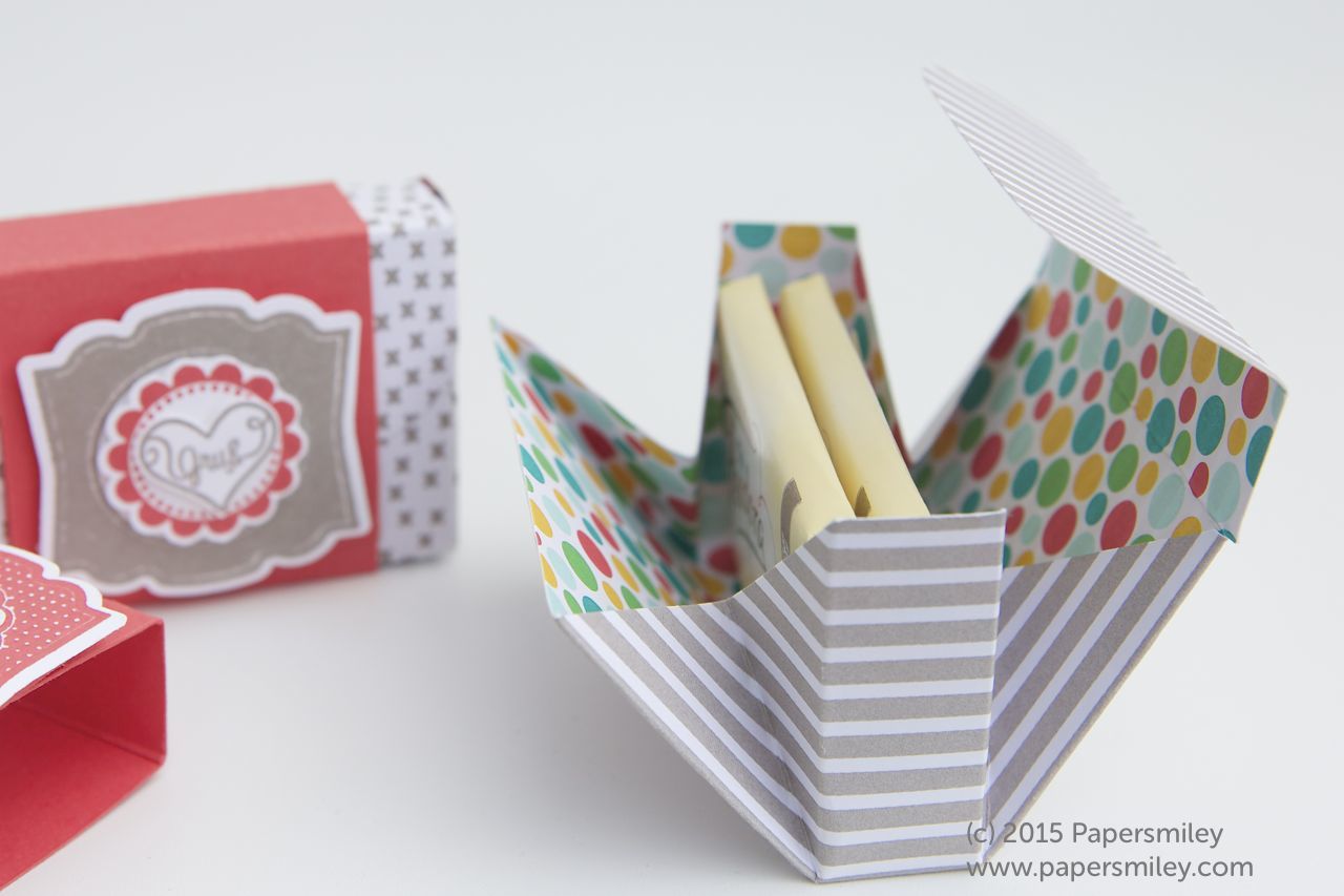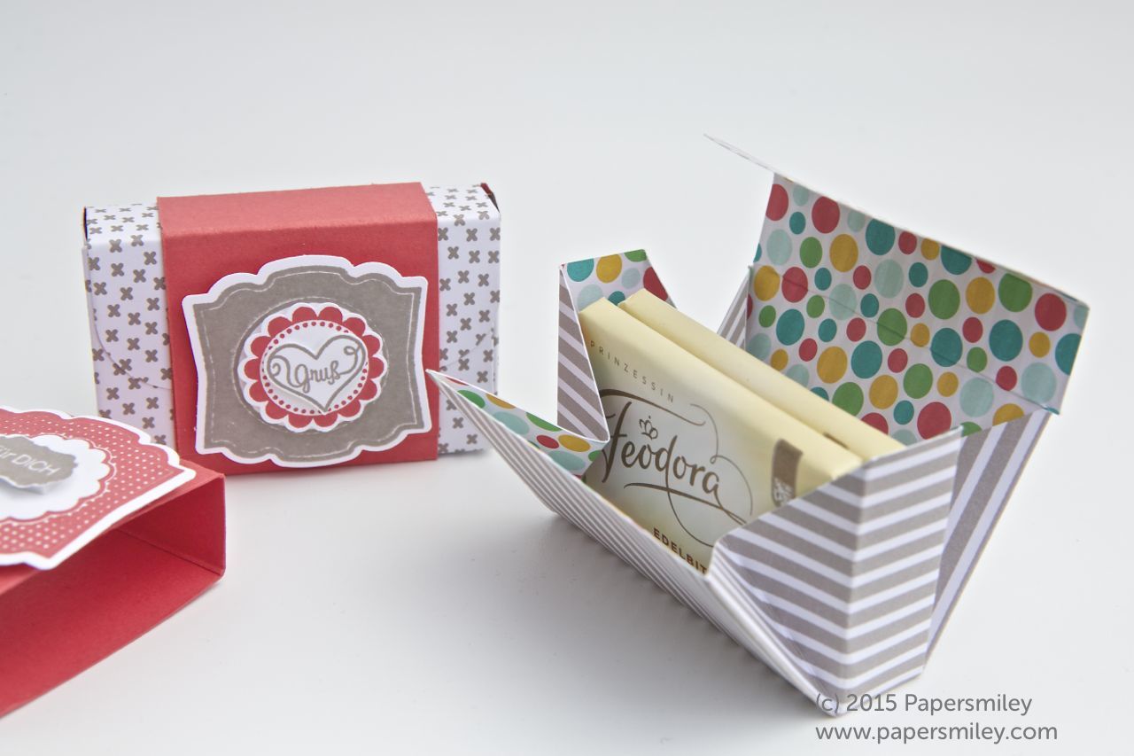 Schokoladen-Verpackung mit DSP Bunte Party von Stampin Up!die neuen kleinen Designerpapier-Blöcke von Stampin Up! rufen förmlich nach kleinen Verpackungen, die man aus so einem 6 x 6 in. (15,2 x 15,2 cm) Blatt erstellen kann. Allerdings müsst ihr da immer aufpassen, denn das DSP ist deutlich dünner als der normale Farbkarton und ist daher etwas gebrechlicher. Wenn die Falzen zu tief gezogen werden, dann bricht das Papier mal gerne beim ersten Falten. Also immer schön vorsichtig. Das hatte ich dann auch nach den ersten auseinander gefallenen Boxen wieder verstanden 🙂