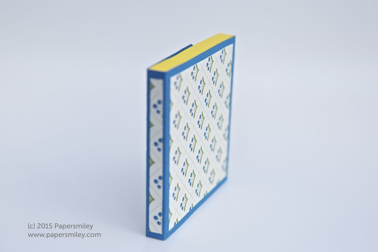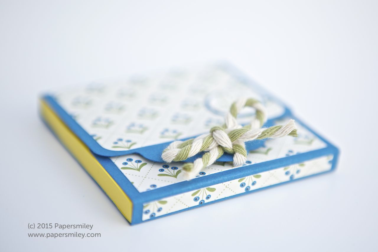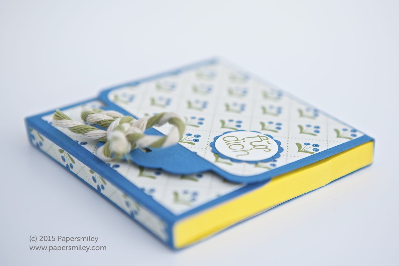 Und damit die kleinen Blätter nicht in der Tasche verknicken, muss man sie einpacken. Natürlich. Ich habe hier pazifikblauen Cardstock verwendet. Den benutze ich nicht oft, aber zu diesem DSP hat er super gepasst. Die Kombination sieht einfach süß aus.