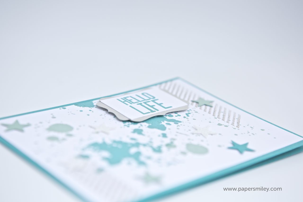 Das Tag ist einfach zugeschnitten und auf ein aus Minzmakrone Cardstock ausgestanztes Dekoratives Etikett gesetzt. Der Spruch kommt aus dem Stempelset „Hello Life“.