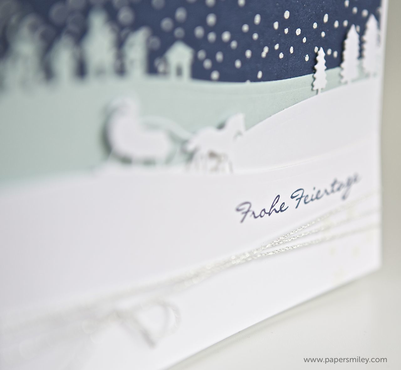 Verwendet habe ich hier alle drei Edgelits aus dem Set Schlittenfahrt. Das sind Stanzformen, die man mit der Big Shot verwendet, wie Framelits auch. Sie stanzen aber keine ganze Form aus, sondern nur den Rand des Cardstocks. Man kann sie dann in Lagen übereinander legen und so eine Landschaft werkeln.