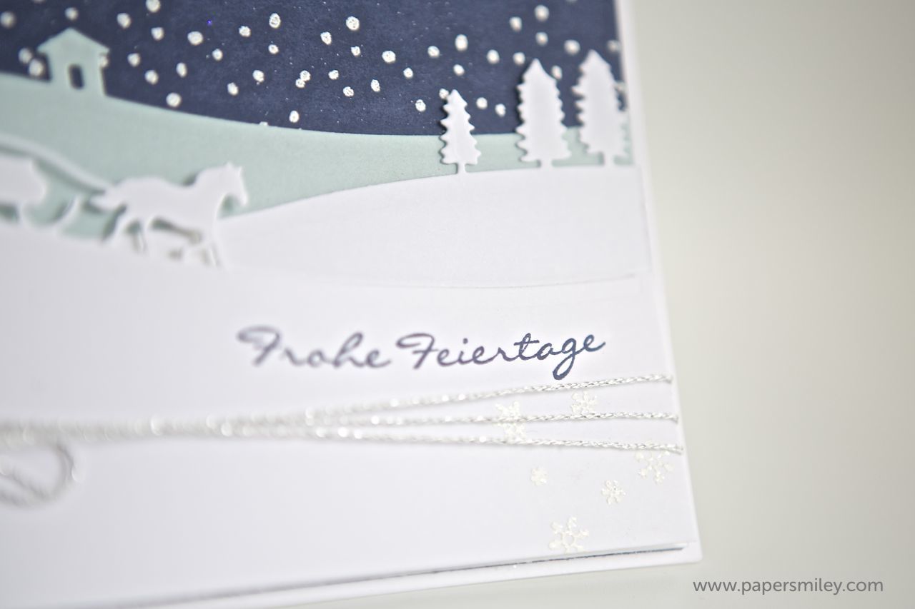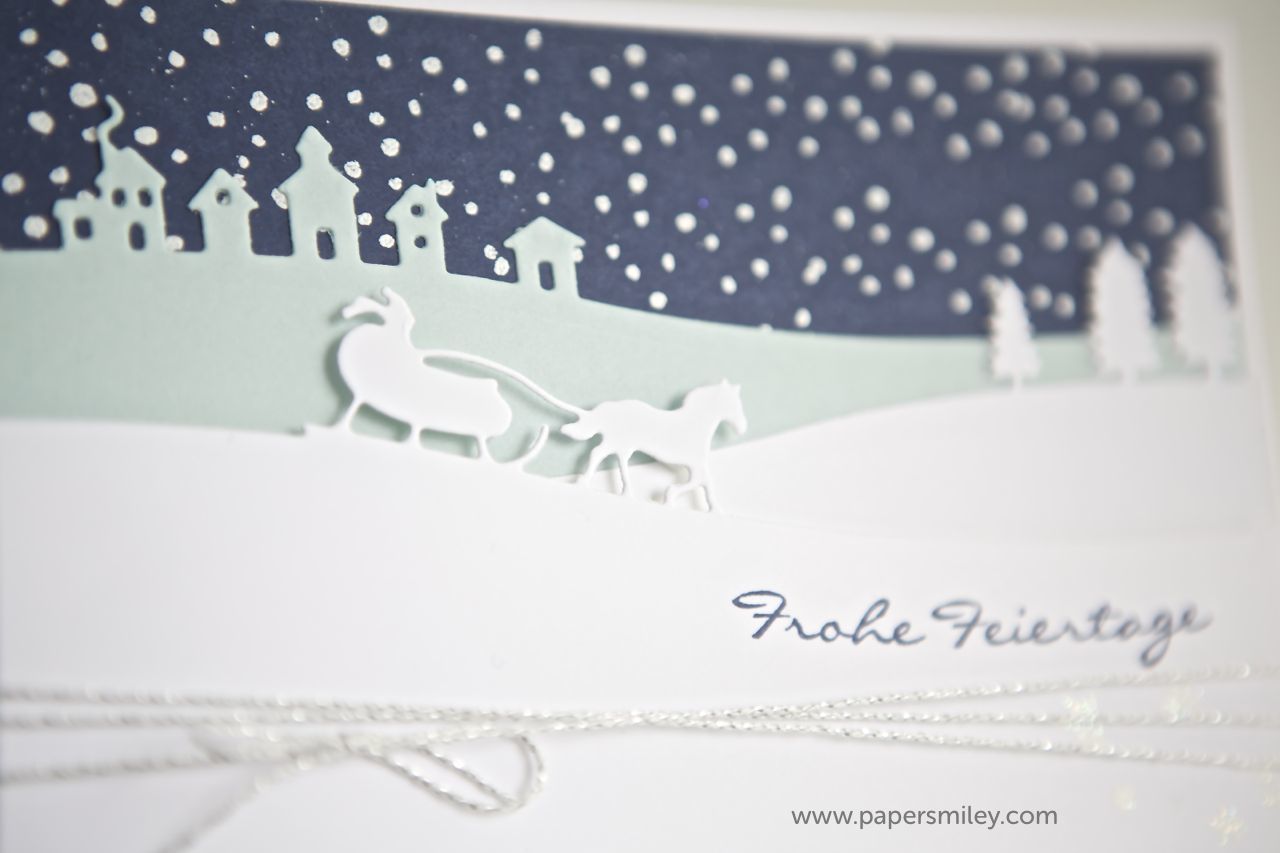 Weihnachtskarte mit den Edgelits von Stampin Up!Weihnachtskarte mit den Edgelits von Stampin Up!Es gibt ein Edgelit mit den Häusern (die hintere Form in Himmelblau), eins mit Tannenbäumen (das mittlere in Flüsterweiß) und eins mit Schlitten und Pferd (im Vordergrund, auch in Flüsterweiß).