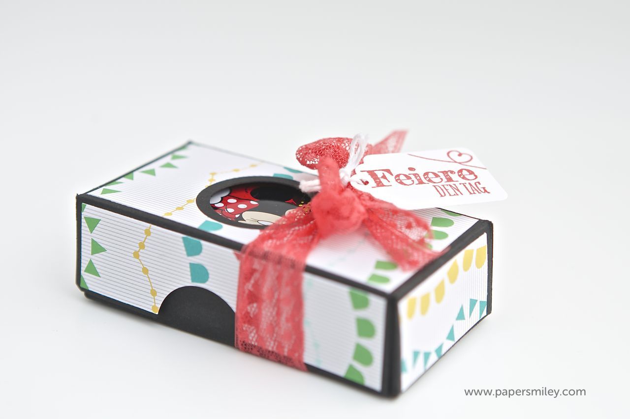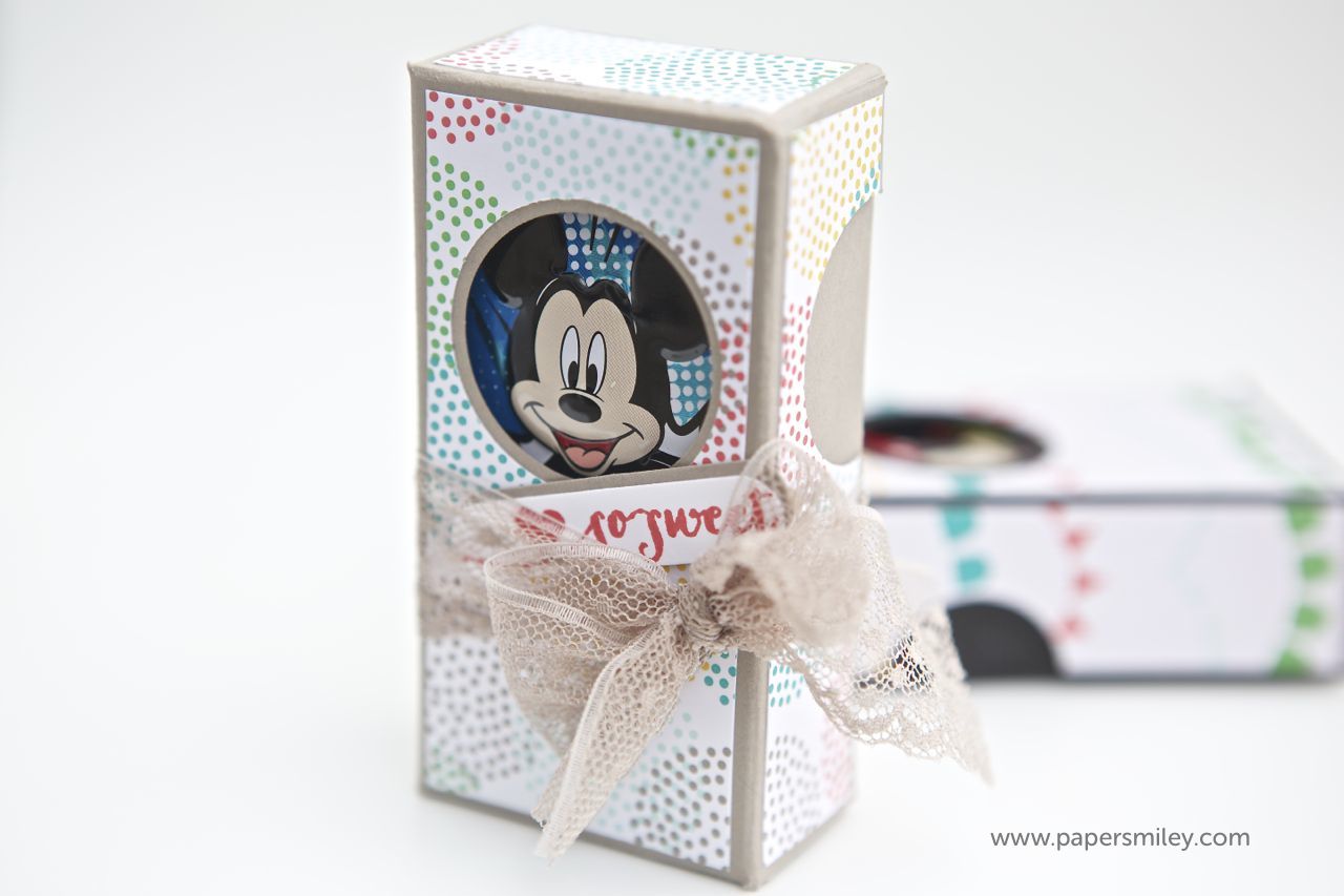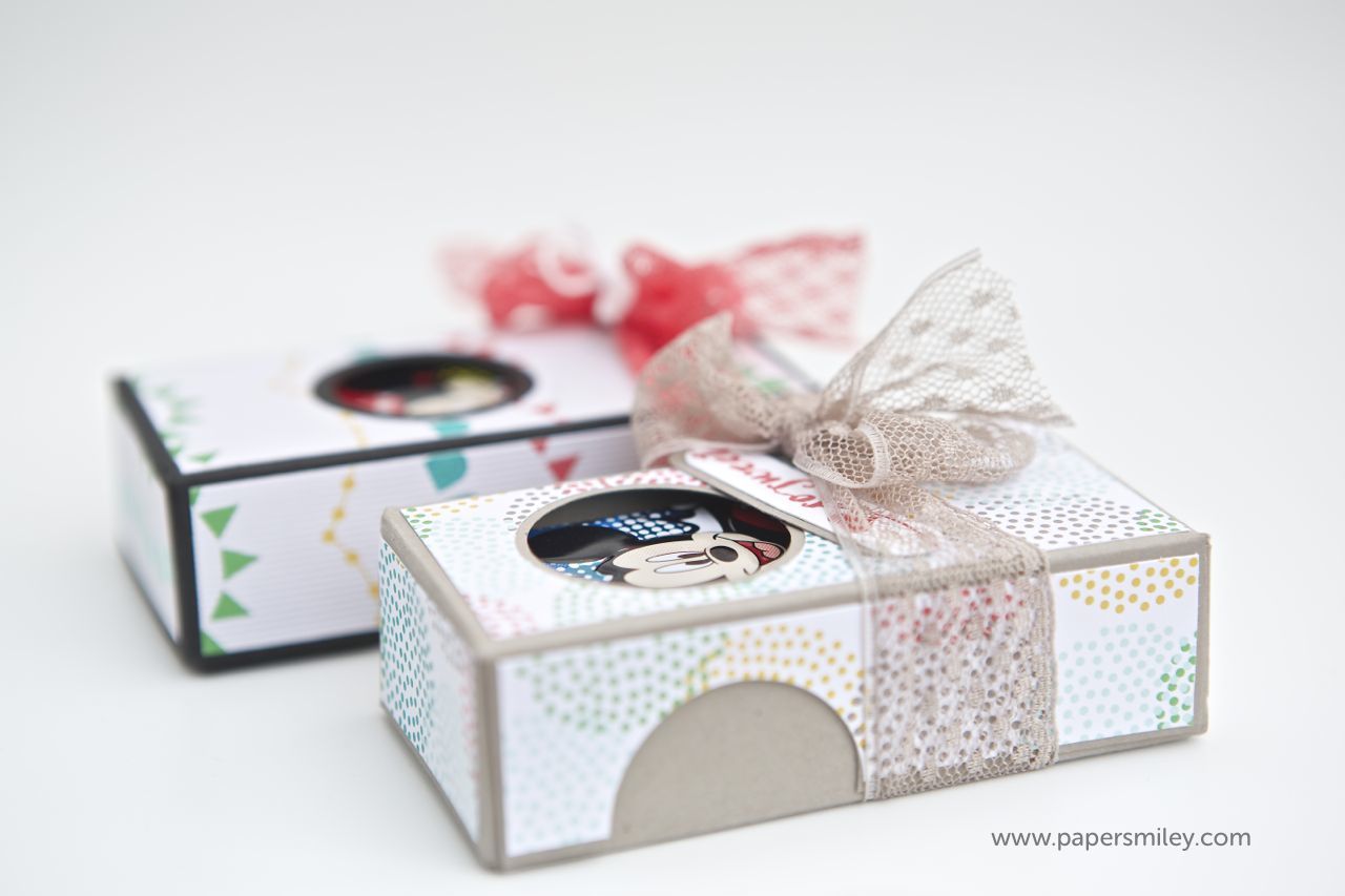 ok, erstmal keine weitere Weihnachtskarte, sondern eine Verpackung. Ich habe hier kleine Verpackung für die süßen Micky und Minnie Schoko-Boxen gebastelt. Damit man den Inhalt erahnen kann, gibts ein kleines Fensterchen, aus dem Micky und Minnie rausschauen. 🙂
