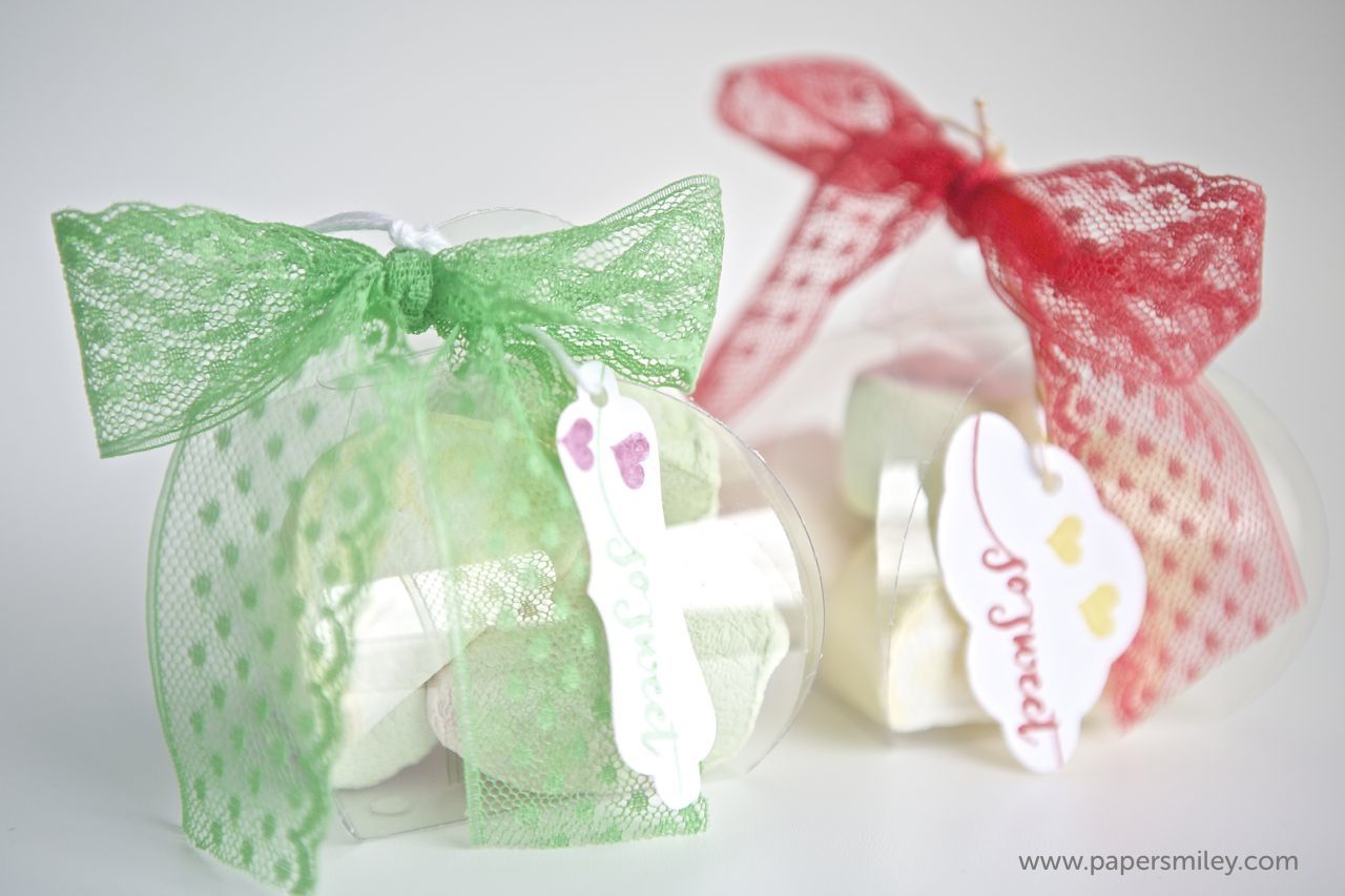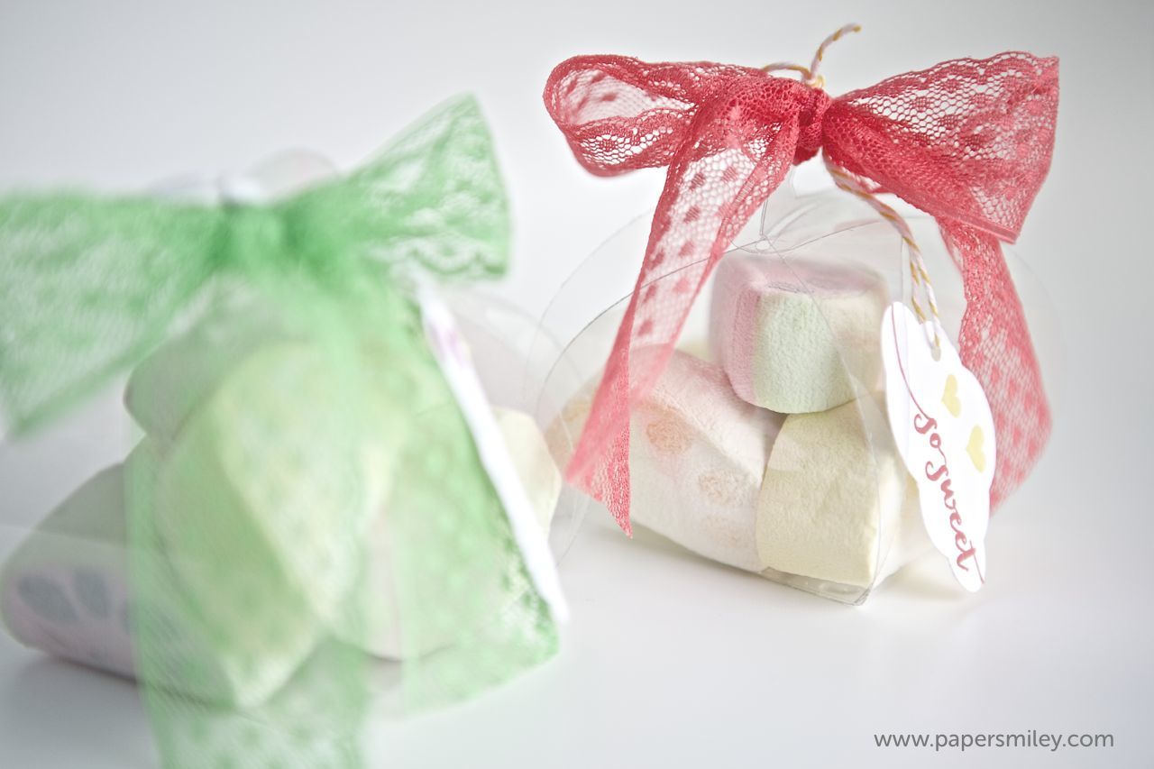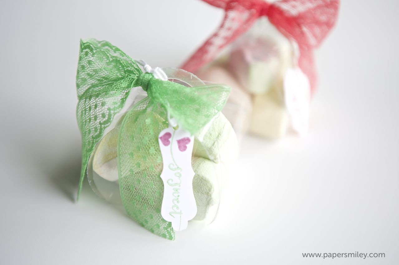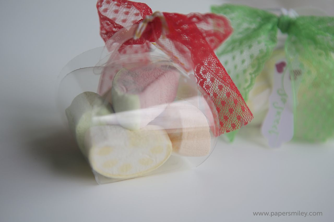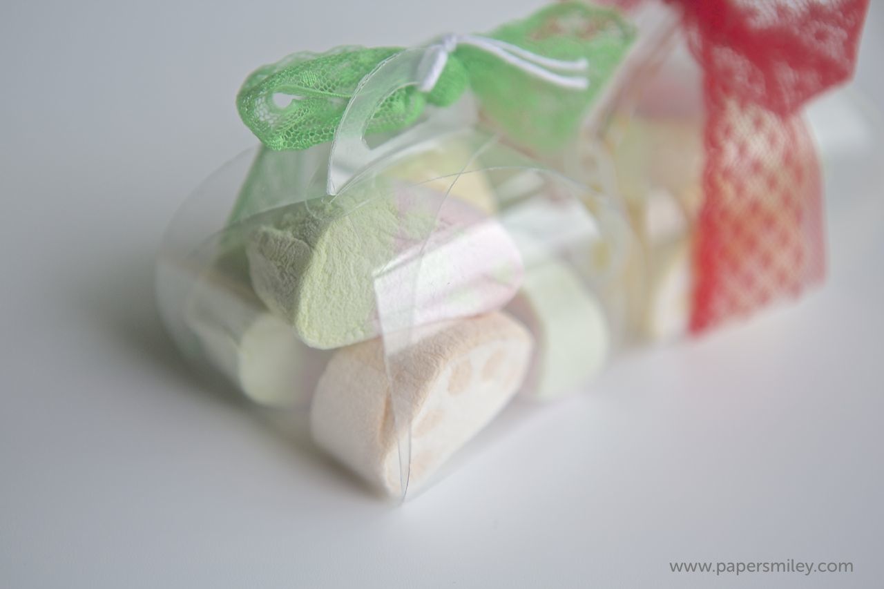 ich doch letztens Marshmellows gefunden, die in Pastellfarben und in Fruchtformen daherkamen. Die mußte ich einfach verpacken 😉