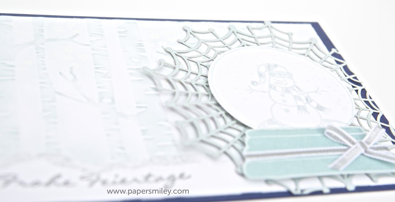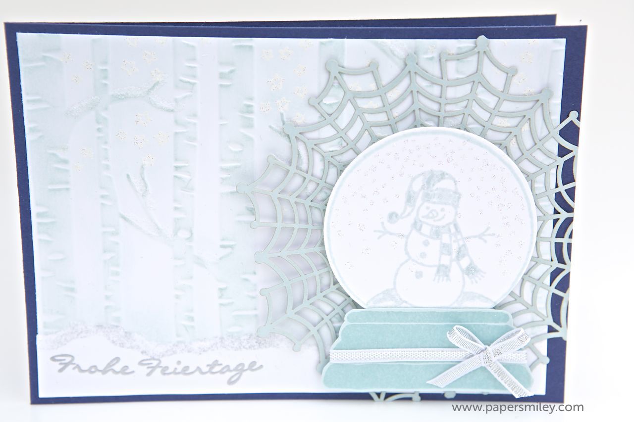Der Schneemann kommt aus dem Stempelset Sparkly Seasons. Damit lässt sich deine Schneekugel mit verschiedenen Figuren erstellen. Die Basis habe ich ausgeschnitten (ja, tatsächlich mit der Hand, ganz ohne Stanze 😉 ) Für die Kugel selbst gibt es eine Framelit-Form in dem Set Im Rahmen der Feiertage.
