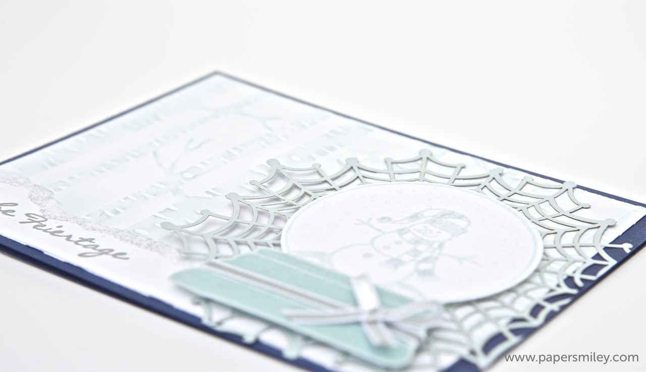 Hinter der Schneekugel habe ich das Zierdeckchen Spinnennetz verwendet. Das ist eigentlich auf der Vorderseite schwarz und als Spinnennetz für Halloween oder sonstige gothic Einsätze gedacht. Wenn man es aber umdreht ist es weiß und lässt sich in jeder Farbe kolorieren. Hier in Himmelblau.