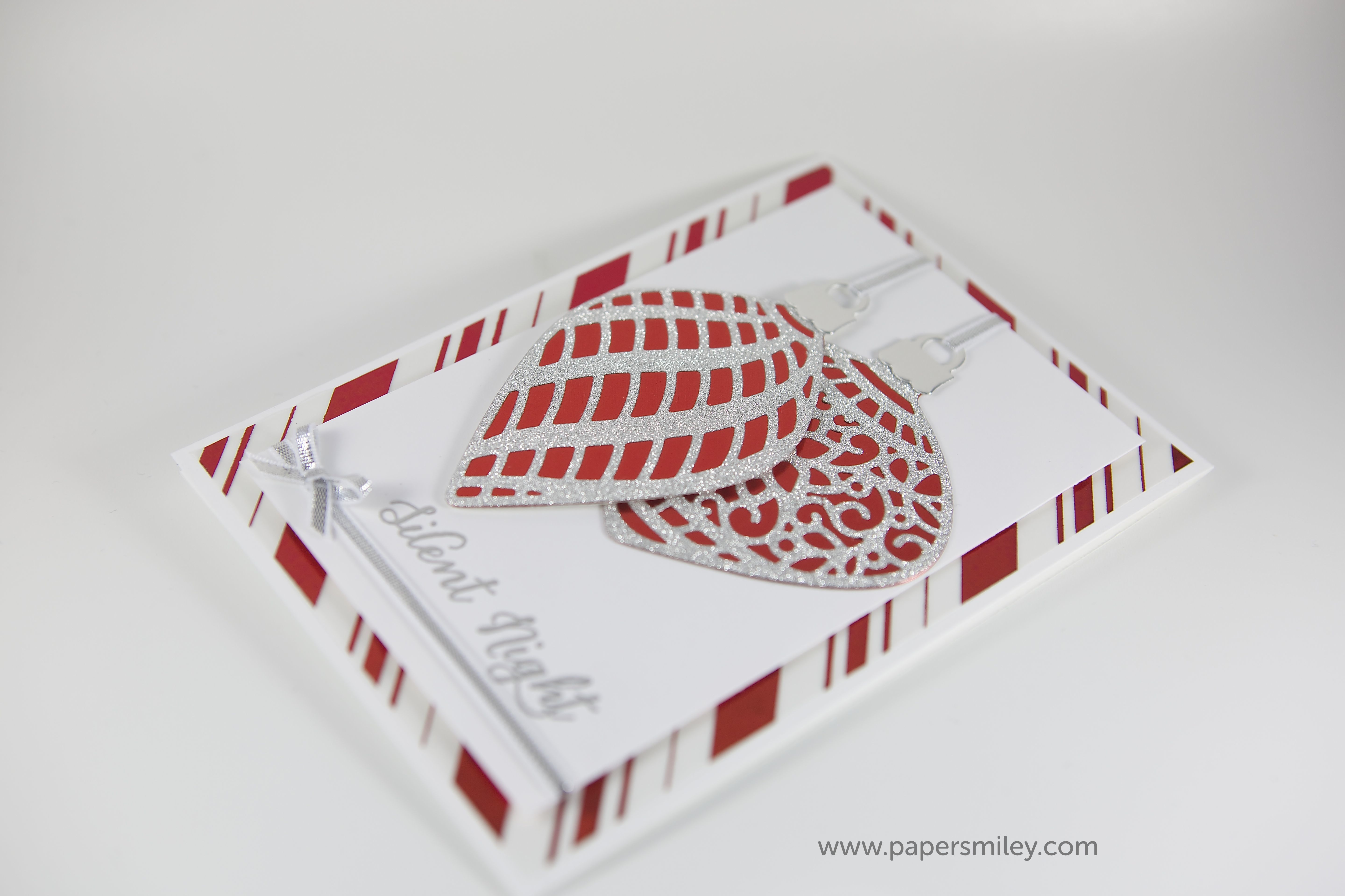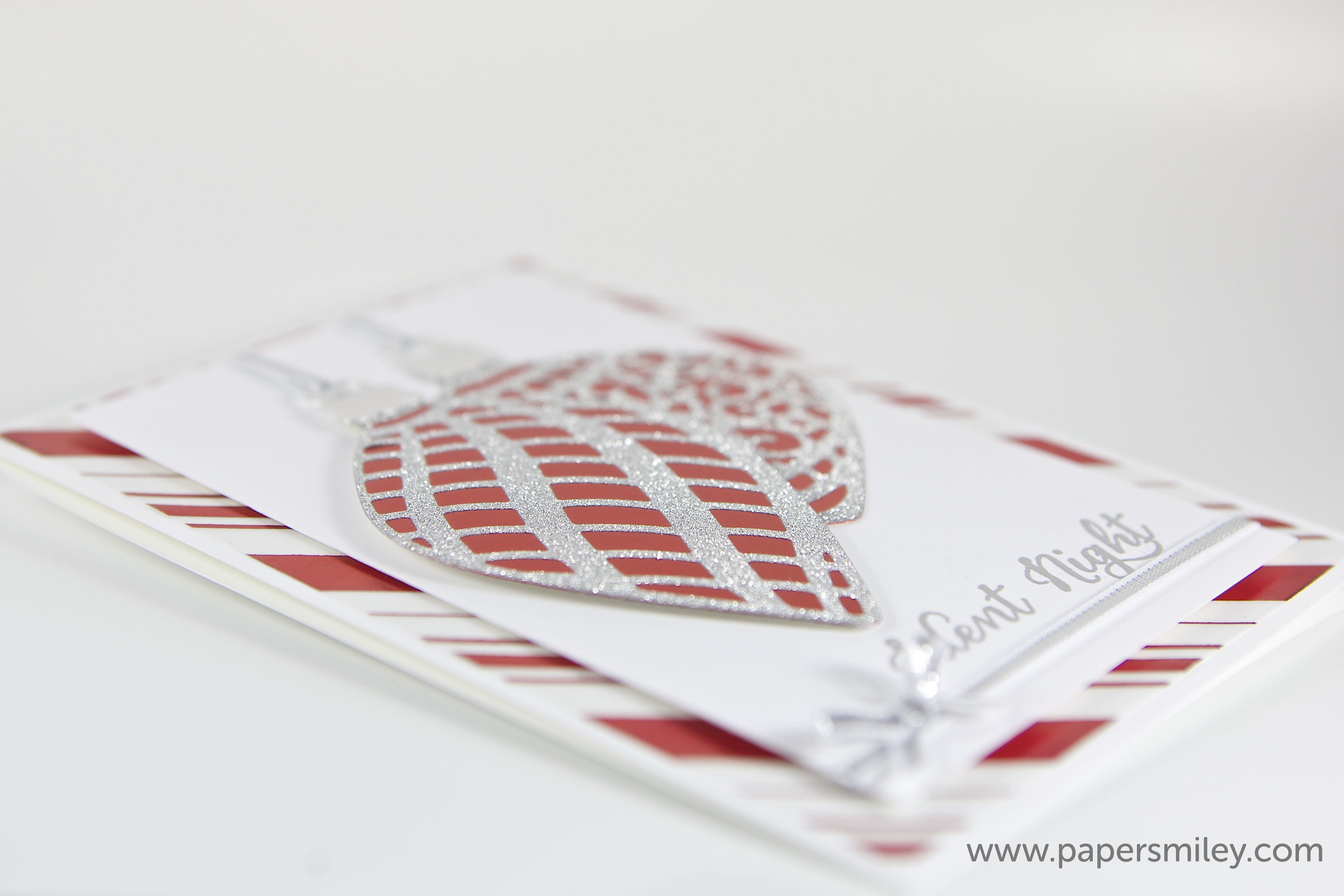 und wieder eine Weihnachtskarte. Diesmal mit den Thinlits Formen Am Christbaum. Das sind wunderschöne Stanzen für Christbaum-Anhänger. Die müssen natürlich mit viel Glitzer verwendet werden 🙂
