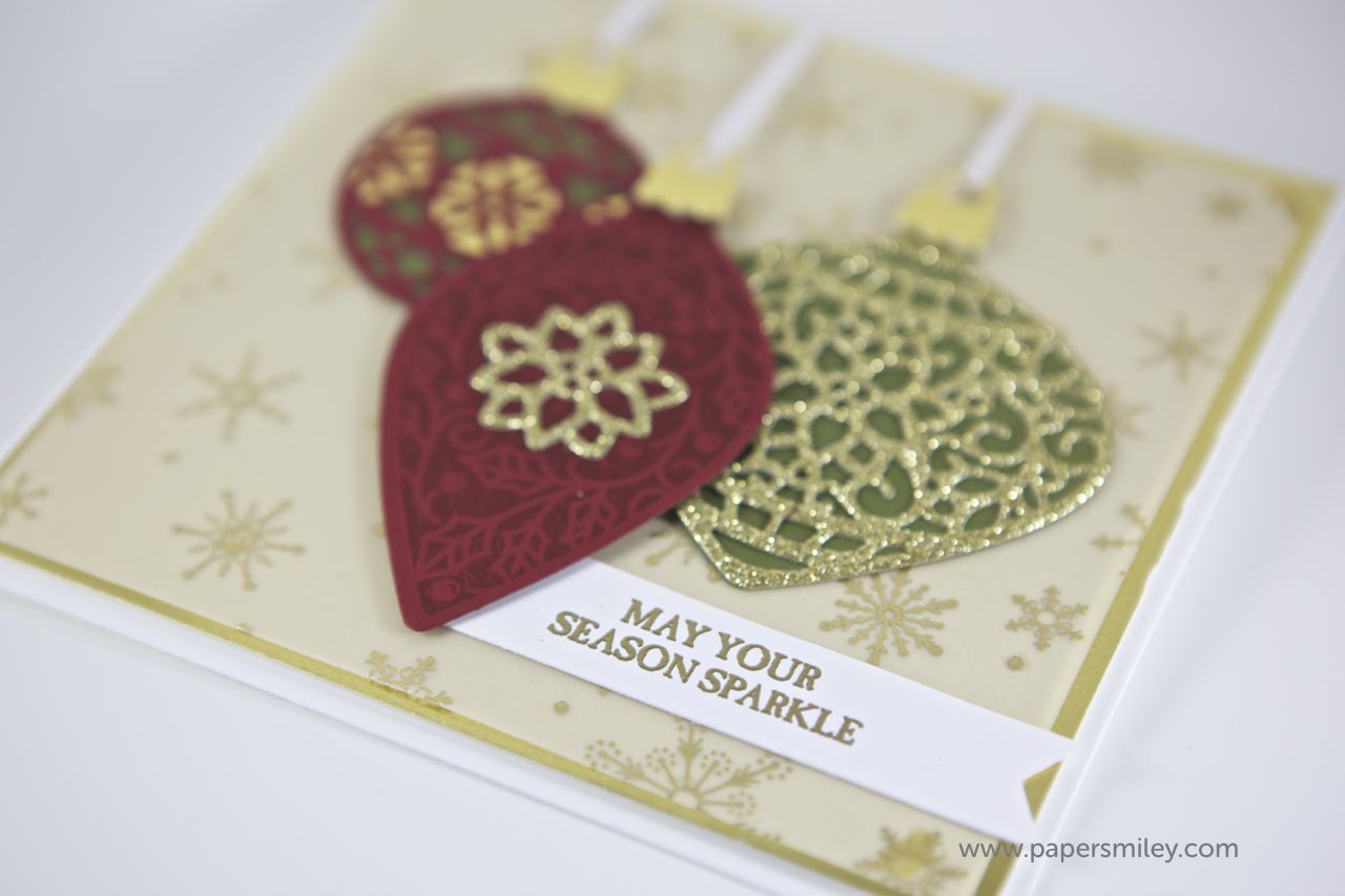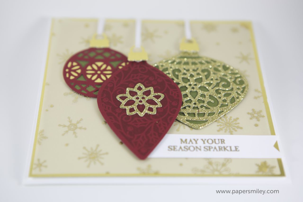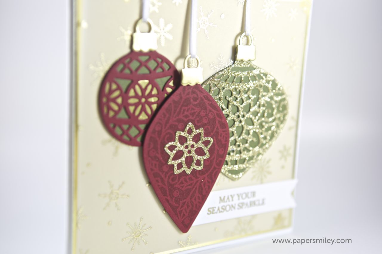 Ich habe hier nochmal die Thinlits Formen am Christbaum verwendet, diesmal zusammen mit dem passenden Stempelset Zauberhafte Zierde. Mit den Thinlits lassen sich sowohl die filigranen Weihnachtsbaum-Anhänger ausstanzen, als auch die Anhänger als Form. D.h. wenn man einen Anhänger gestempelt hat, lässt er sich als ganzes ausstanzen.