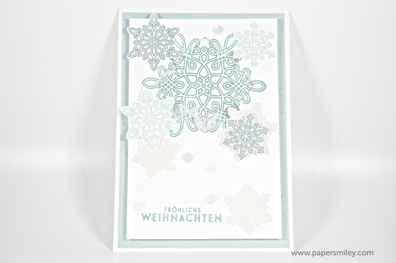 …und hier ist die zweite Schüttelkarte. Diesmal mit Schneeflocken aus dem neuen Stempelset Flockenzauber. Gefüllt ist sie wieder mit weißen Pailletten, die selbst ein bisschen wie Schneeflocken aussehen 🙂