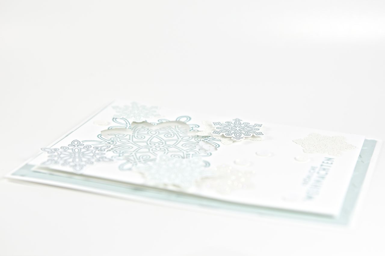 Die Karte ist in den Farben Lagunenblau, Aquamarin und Bermudablau gehalten. Das Fenster ist mit der Blütenmedaillon-Stanze ausgestanzt. Die passt eigentlich genau zum zweit-größten Flockenstempel im Set. Ich habe sie hier aber mit dem größten Stempel zusammen verwendet. Die kleinen Flocken sind mit der passenden Stanze Schneeflocken ausgestanzt.