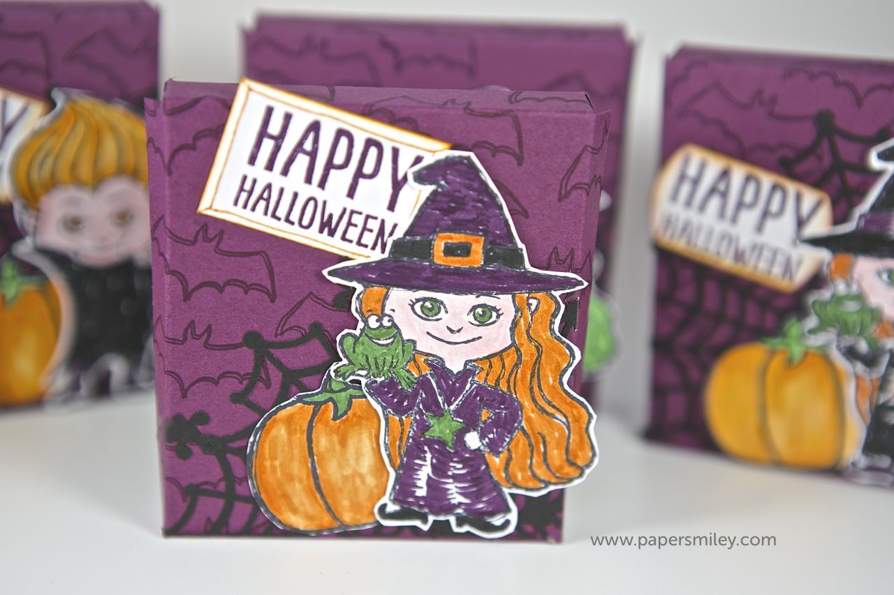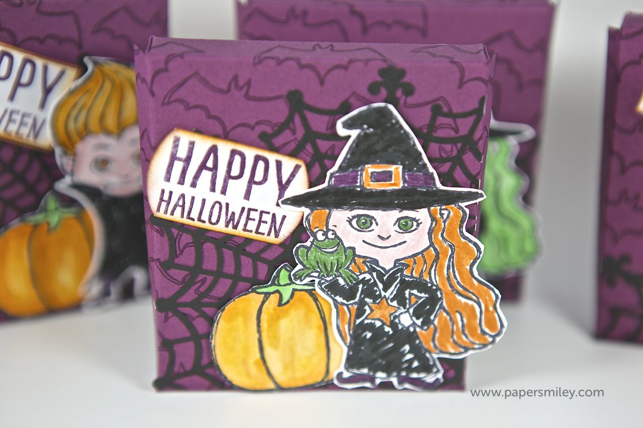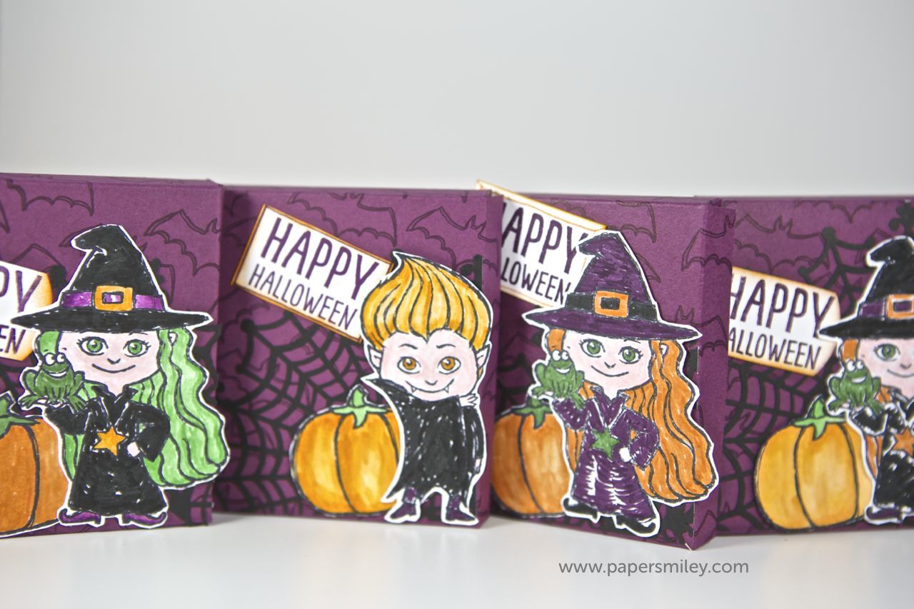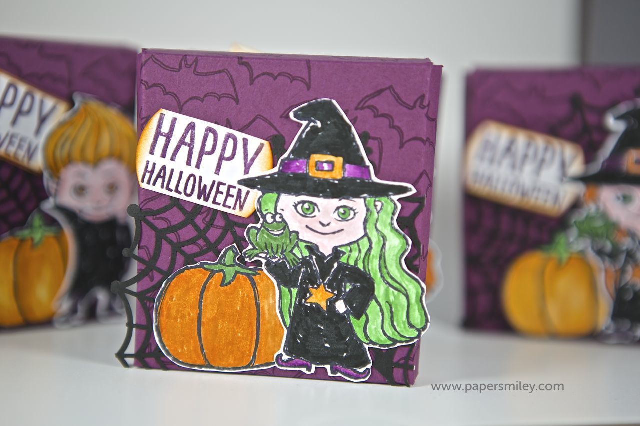 und noch eine kleine Halloween-Treatbox. Hier habe ich das Set Haunt Ya Later verwendet. Das wollte ich erst gar nicht kaufen, weil ich eigentlich nicht so gerne ausmalen und ausschneiden wollte. Aber ich fand den kleinen Vampir und die kleine Hexe so süß, dass ich sie dann doch noch haben musste. Und jetzt muss ich es natürlich auch vor Halloween benutzen 🙂