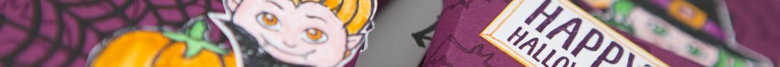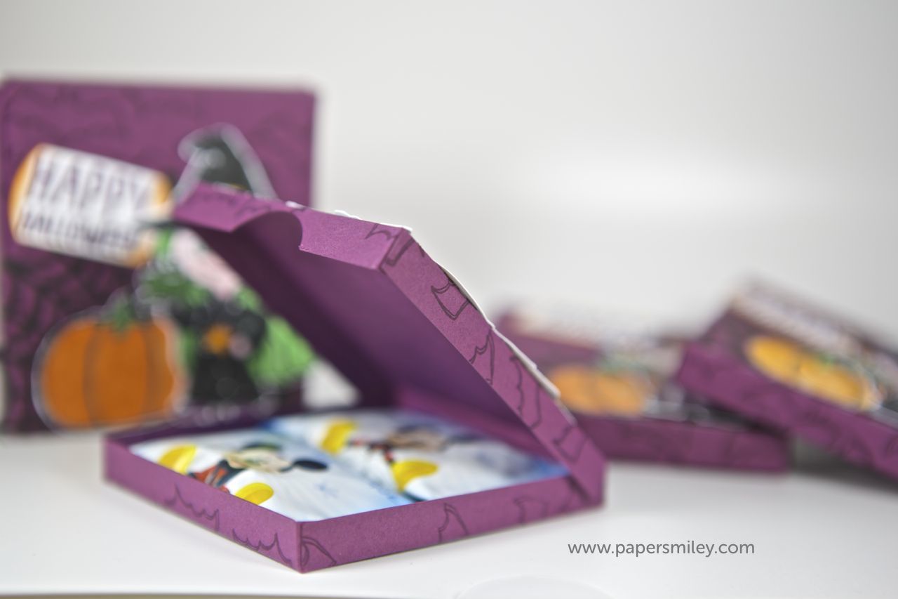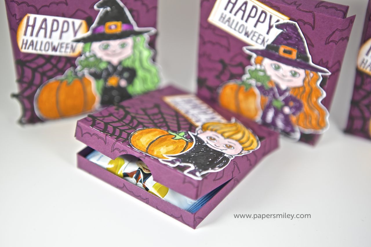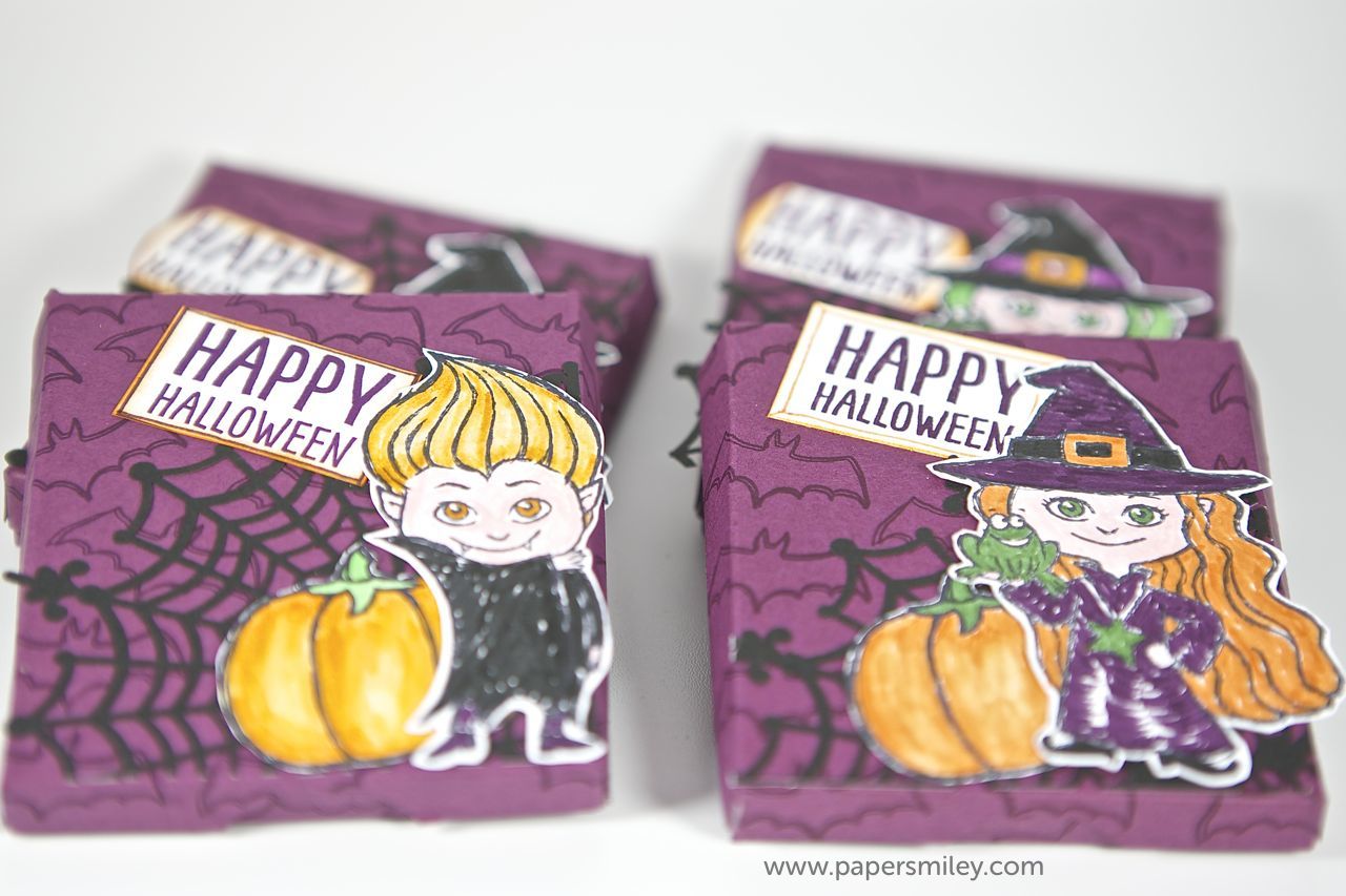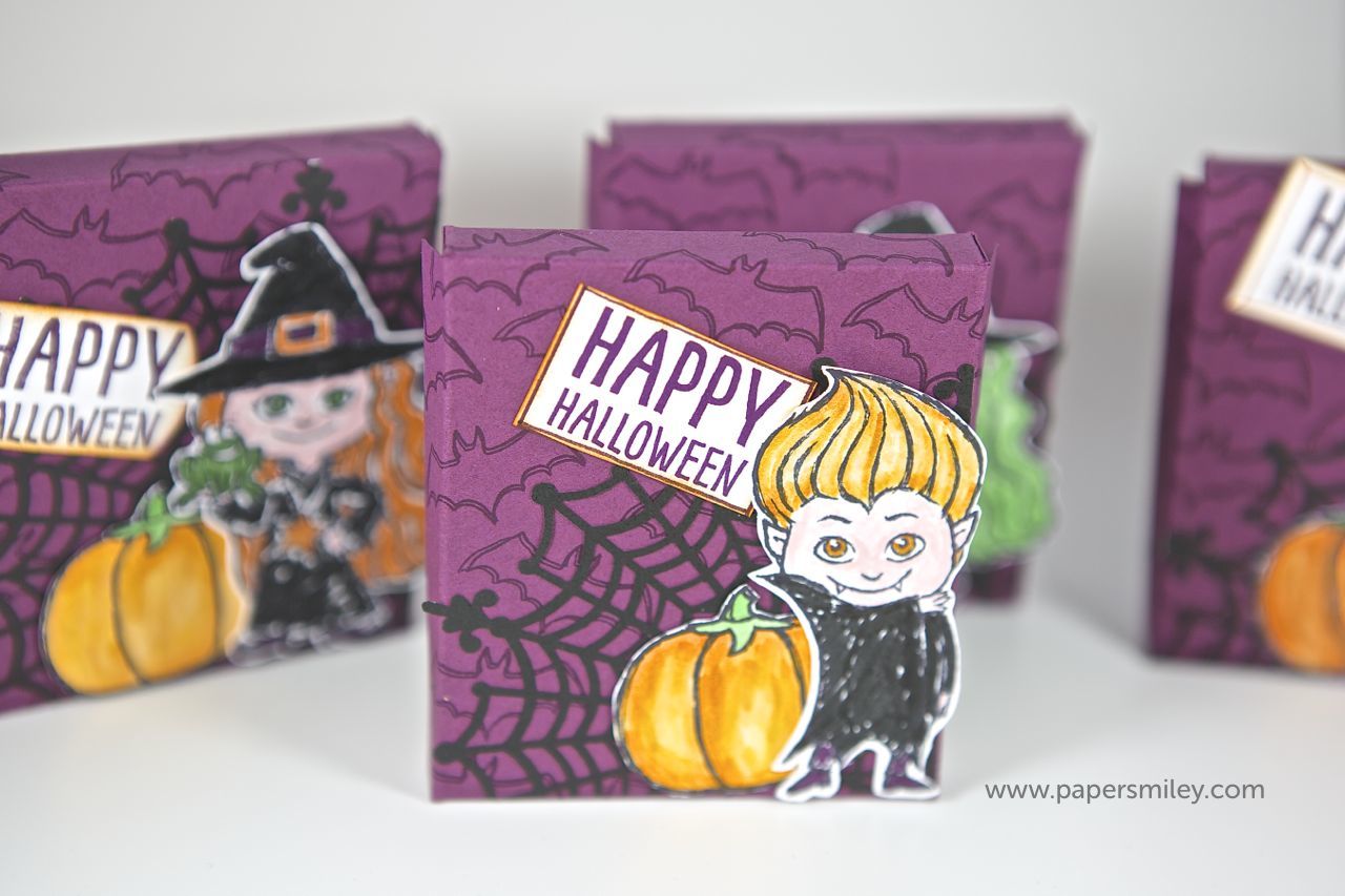 und noch eine kleine Halloween-Treatbox. Hier habe ich das Set Haunt Ya Later verwendet. Das wollte ich erst gar nicht kaufen, weil ich eigentlich nicht so gerne ausmalen und ausschneiden wollte. Aber ich fand den kleinen Vampir und die kleine Hexe so süß, dass ich sie dann doch noch haben musste. Und jetzt muss ich es natürlich auch vor Halloween benutzen 🙂