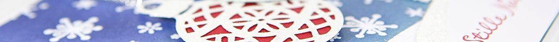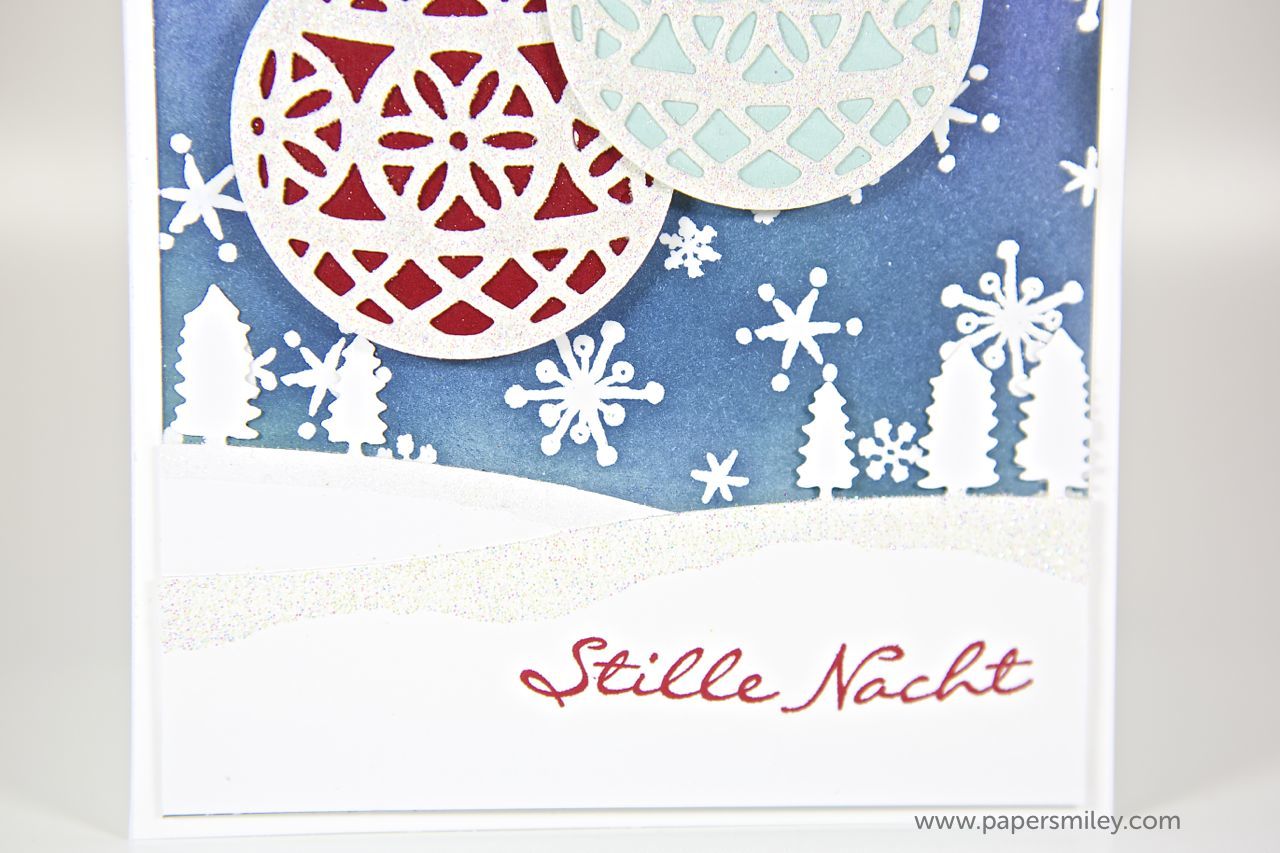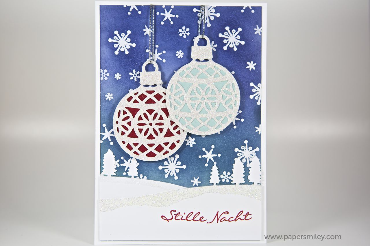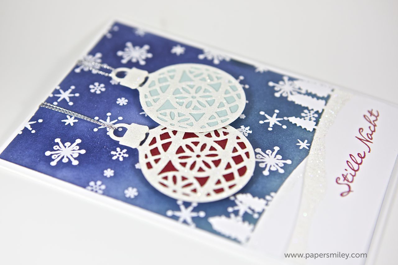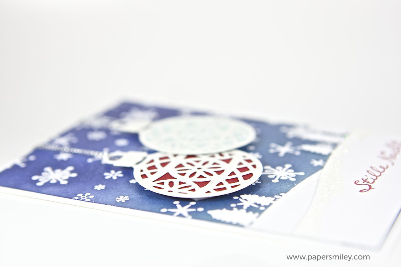 nachdem Halloween vorbei ist, gibt’s jetzt wieder Weihnachtsbasteleien. Ich hatte letzte Woche eine Weihnachtskarte mit zwei runden Weihnachtskugeln gesehen (Blogeintrag hier) und hatte die Idee sie vor einen verschneiten Himmel zu setzen.