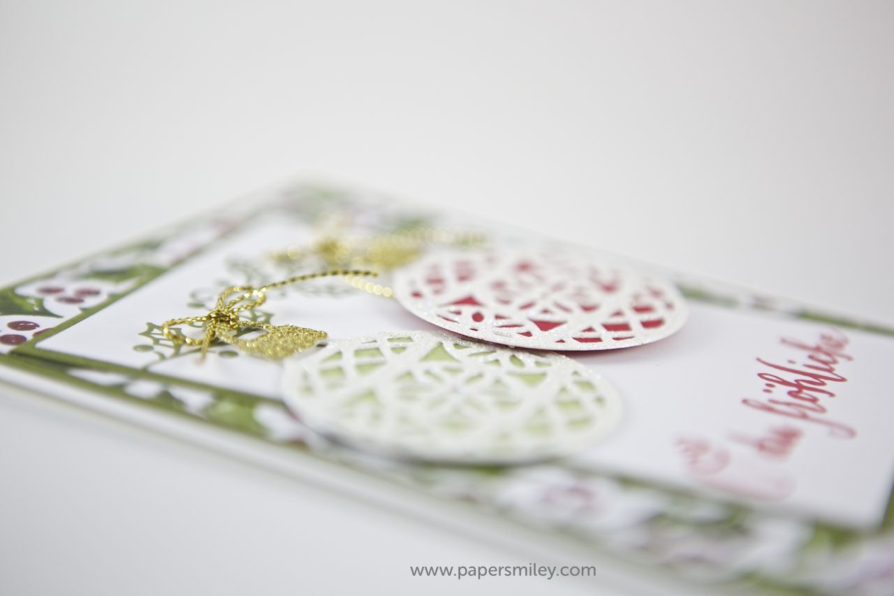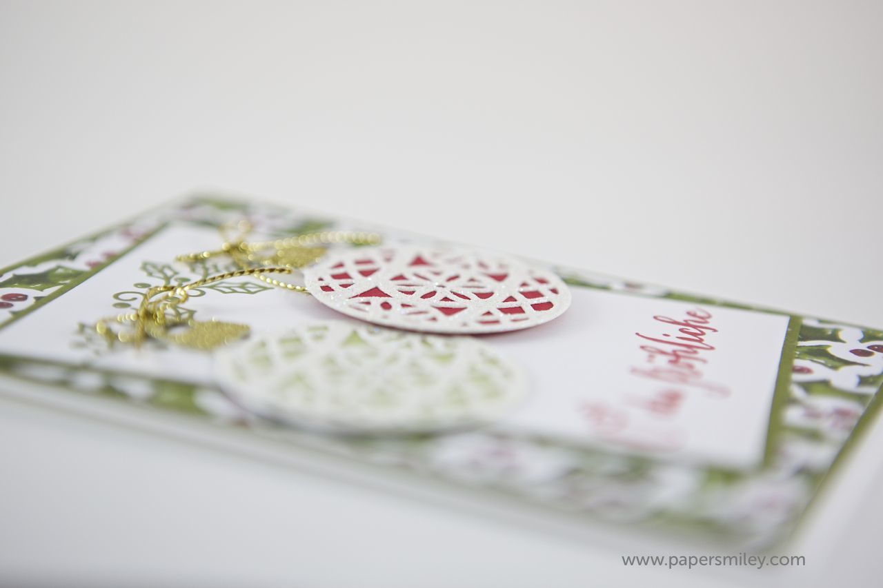 Der Spruch kommt aus dem Stempelset Fröhliche Weihnachten. Auch Glutrot. Und der Mistelzweig-Stempel (in Waldmoos) kommt aus dem Stempelset Zauberhafte Zierde, das passend zu den Thinlits gestaltet wurde.