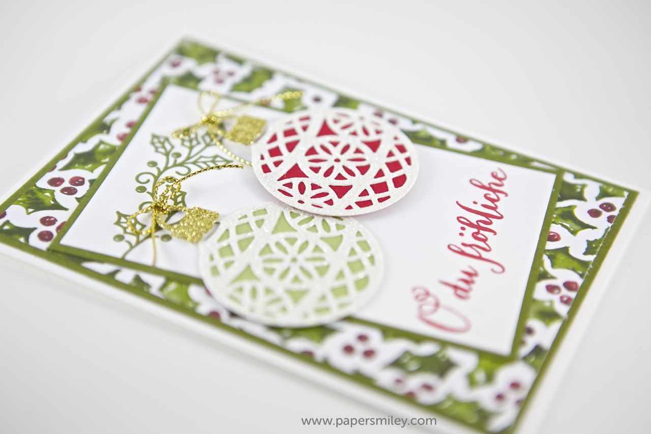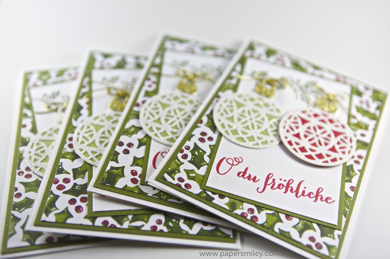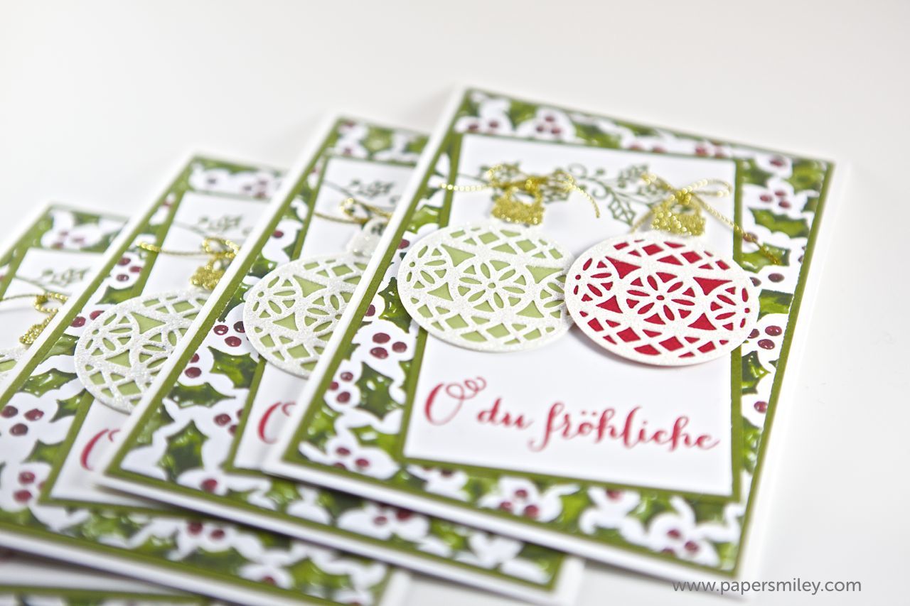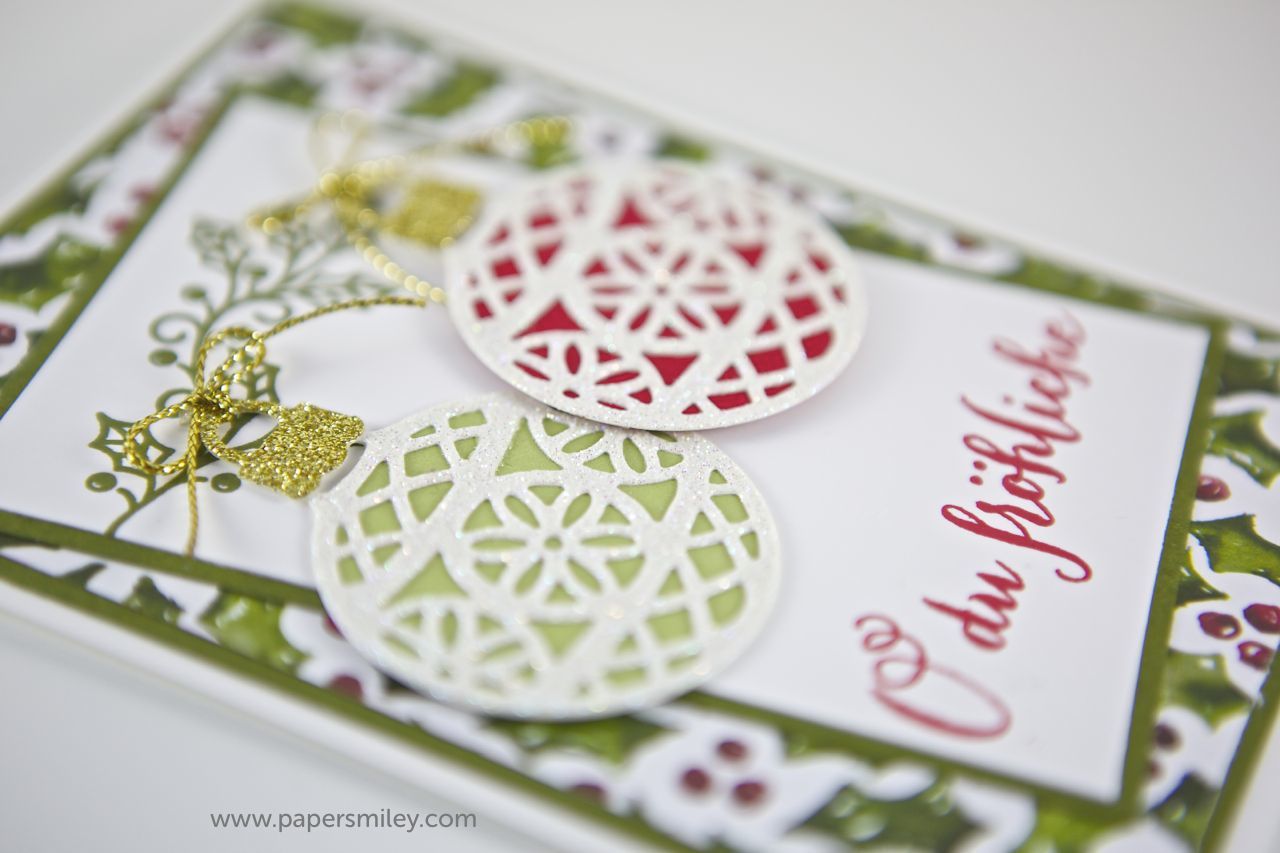Diese hier zeige ich schon mal. Sie sind wieder mit einem meiner Lieblingssets gemacht: mit den Thinlits Formen Am Christbaum. Aus Diamant-Glitzerpapier :-). Natürlich. Und Glutrot und Farngrün.