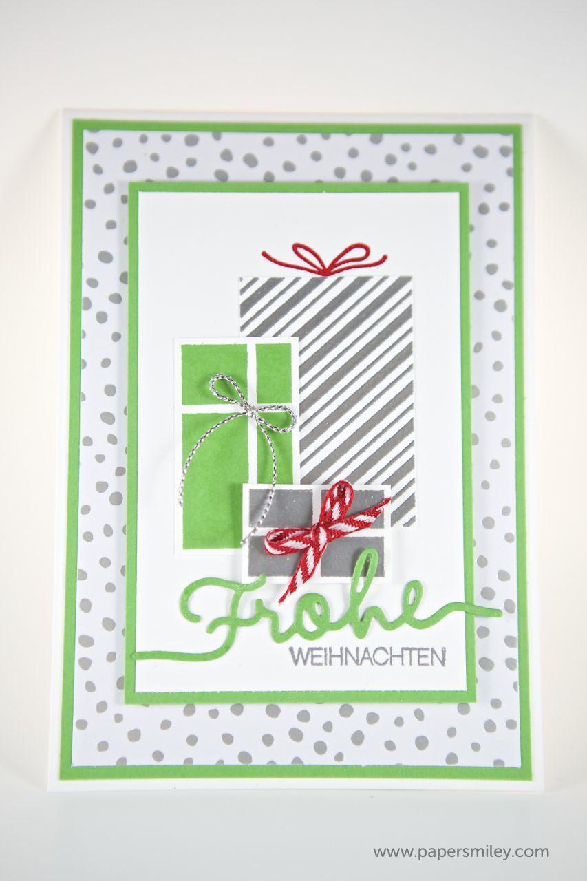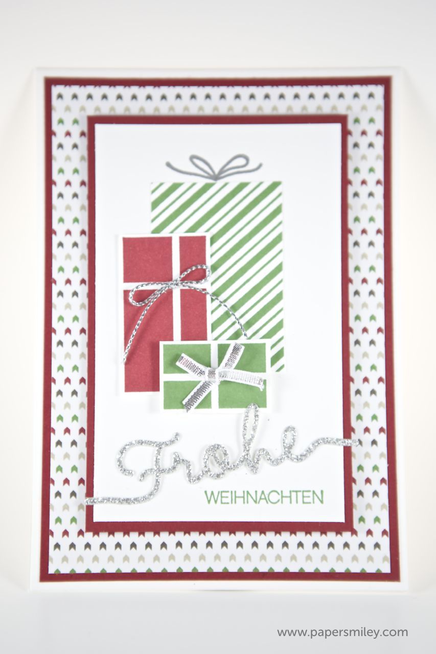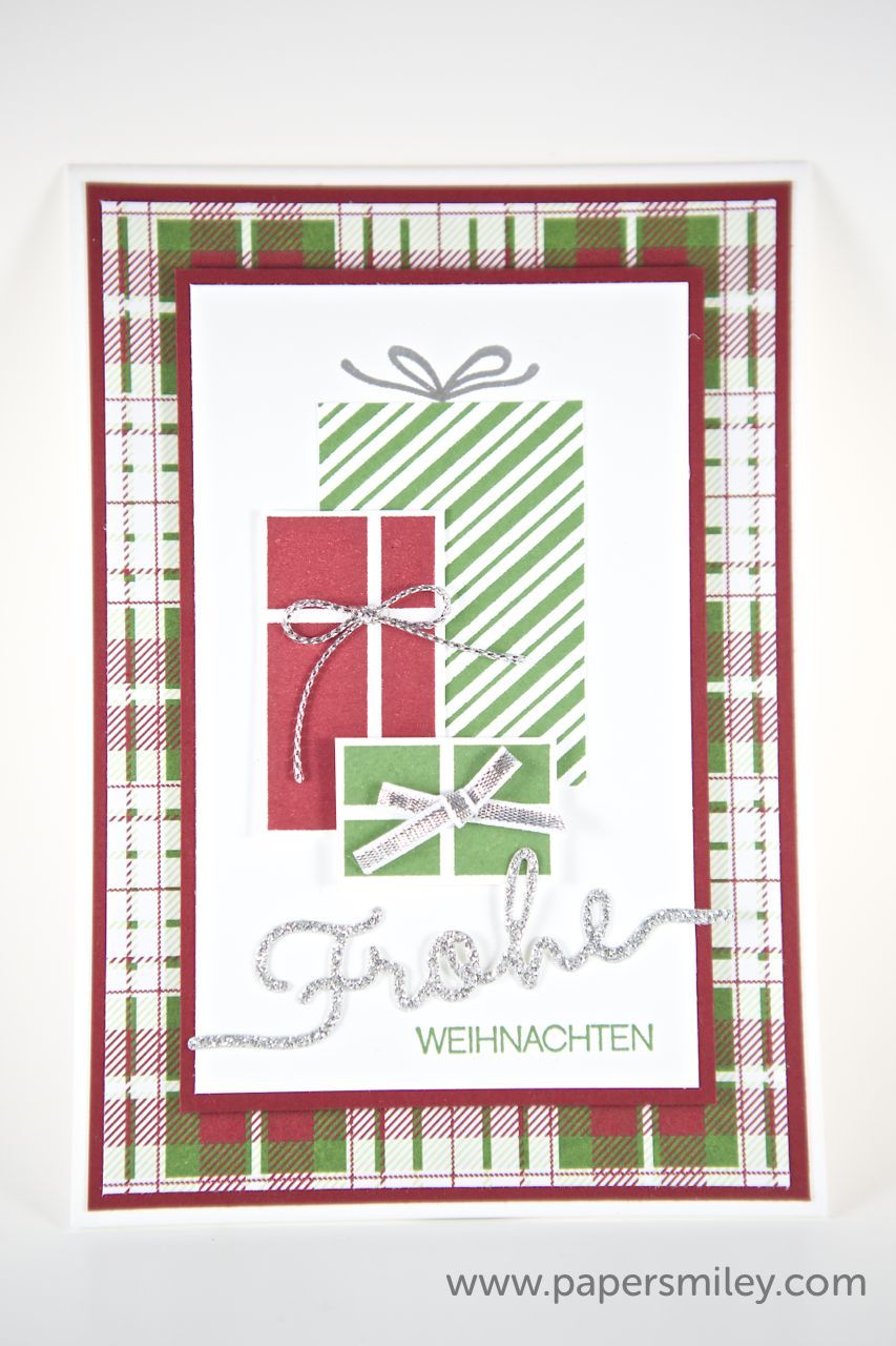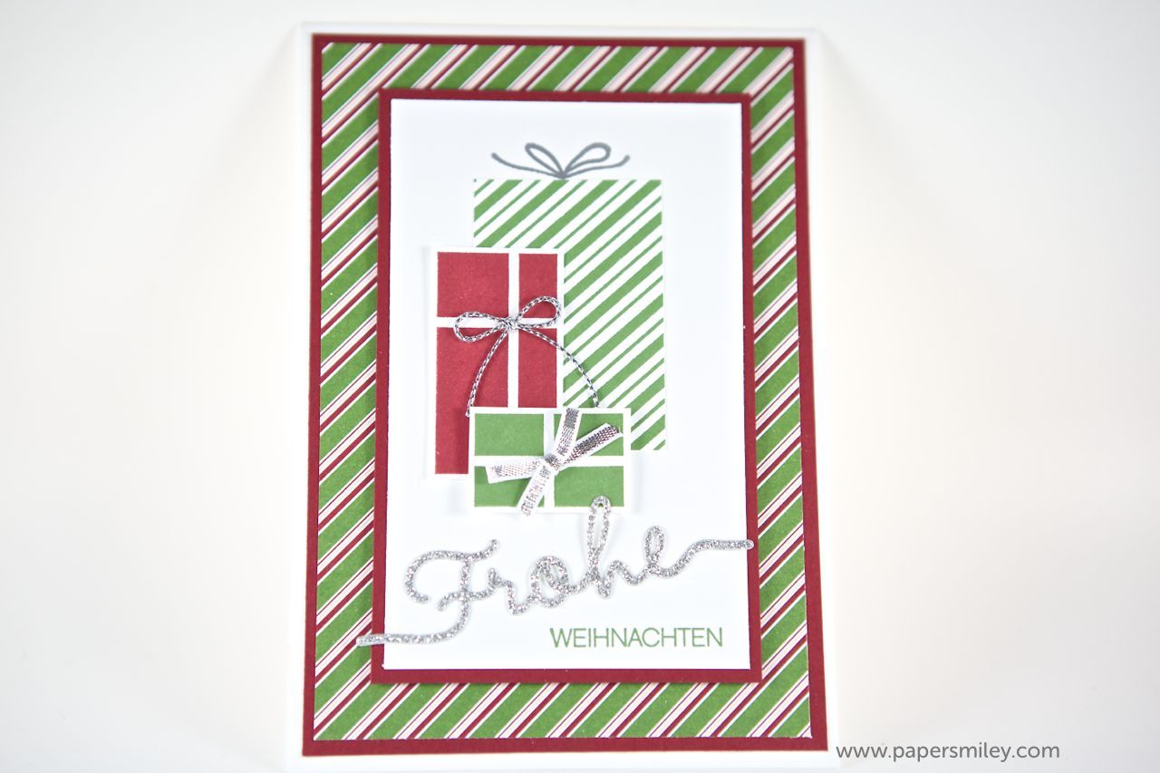 Hier habe ich das Stempelset Your Presents verwendet. Dazu jeweils ein farblich passendes Designer-Papier im Hintergrund. Und der Spruch ist jeweils mit den Thinlits Formen Weihnachtliche Worte gestanzt und mit dem passenden Stempelset Winterliche Weihnachtsgrüße ergänzt.