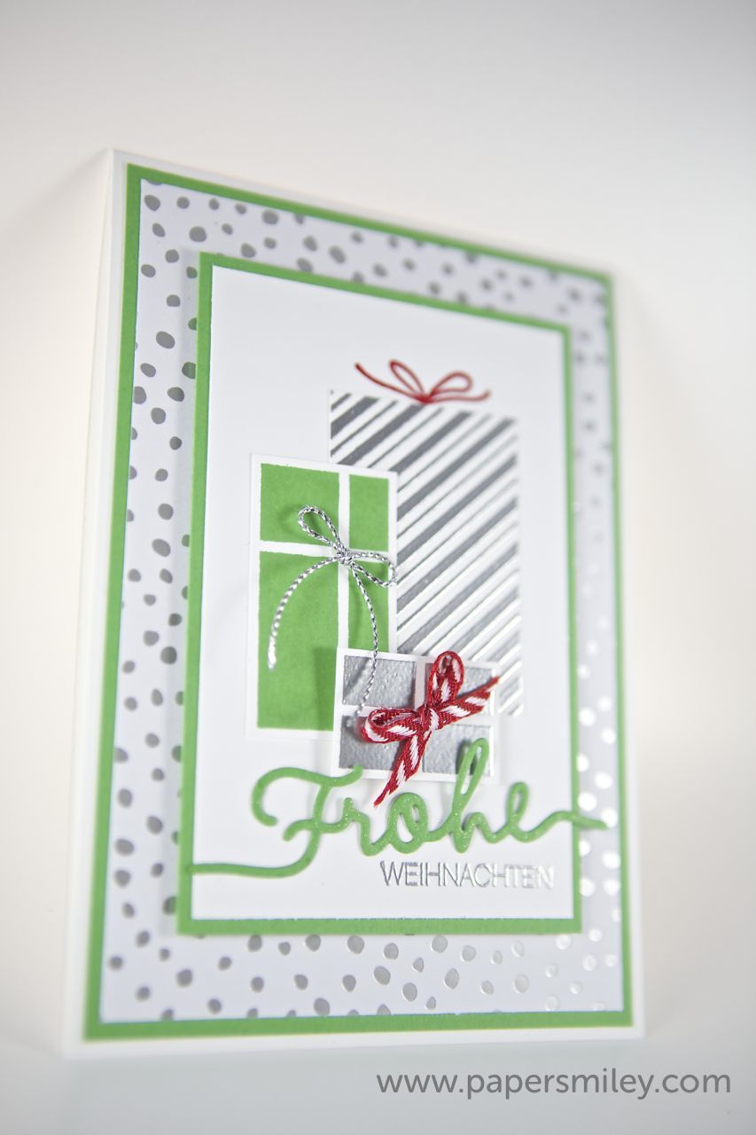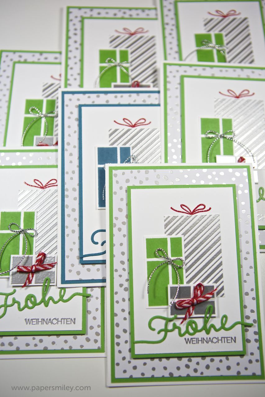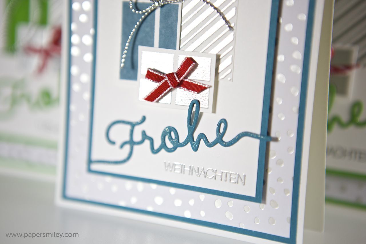 Bei den rot-grünen Karten ist das „Frohe“ aus silbernem Glitzerpapier gestanzt. Bei den grünen und blauen Karten ist es aus normalem Cardstock gestanzt, allerdings ein bisschen mit dem Wink of Stella Stift zum glitzern gebracht. Den benutze ich mittlerweile fast bei jedem Projekt. Und das Beste überhaupt: im neuen Frühjahrs-Katalog von Stampin Up wird der Wink of Stella Stift ins Sortiment aufgenommen 🙂 yay 🙂