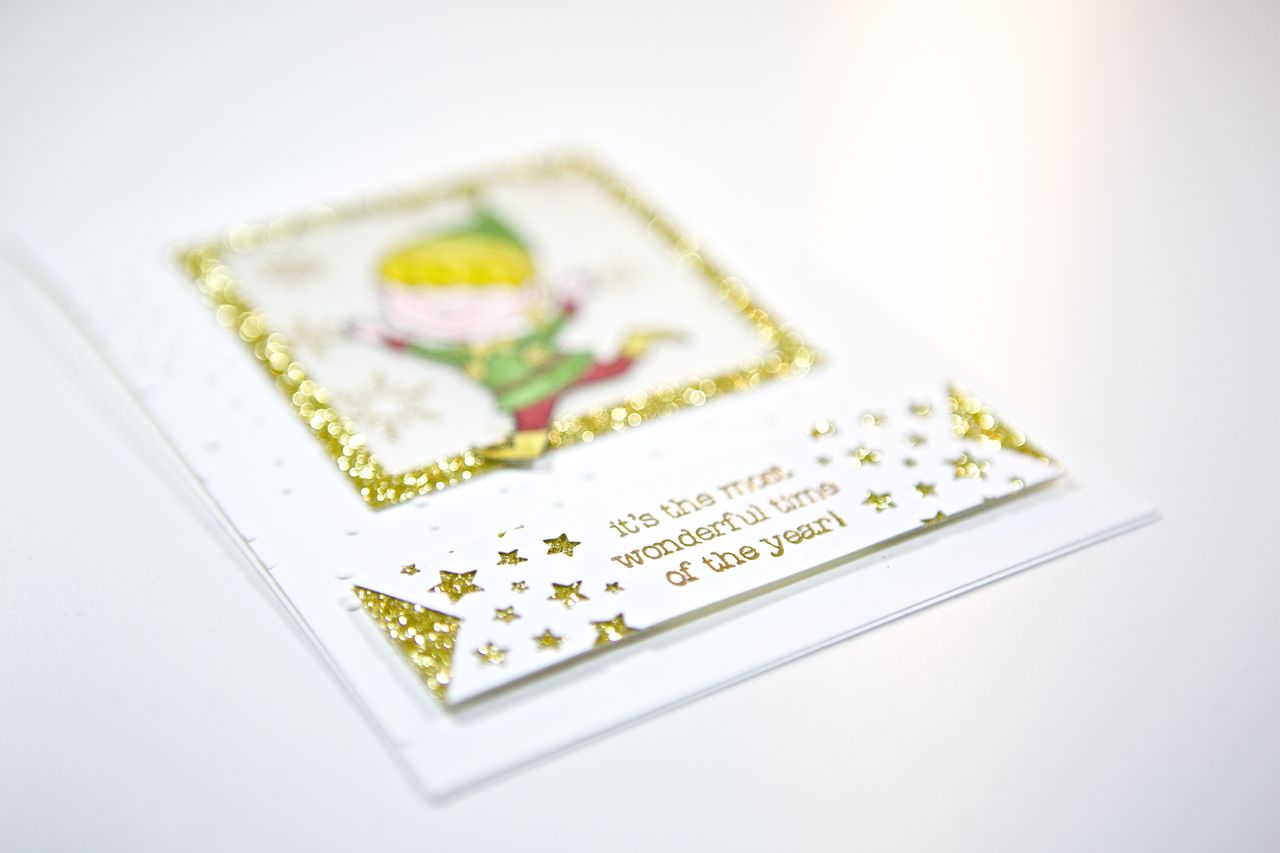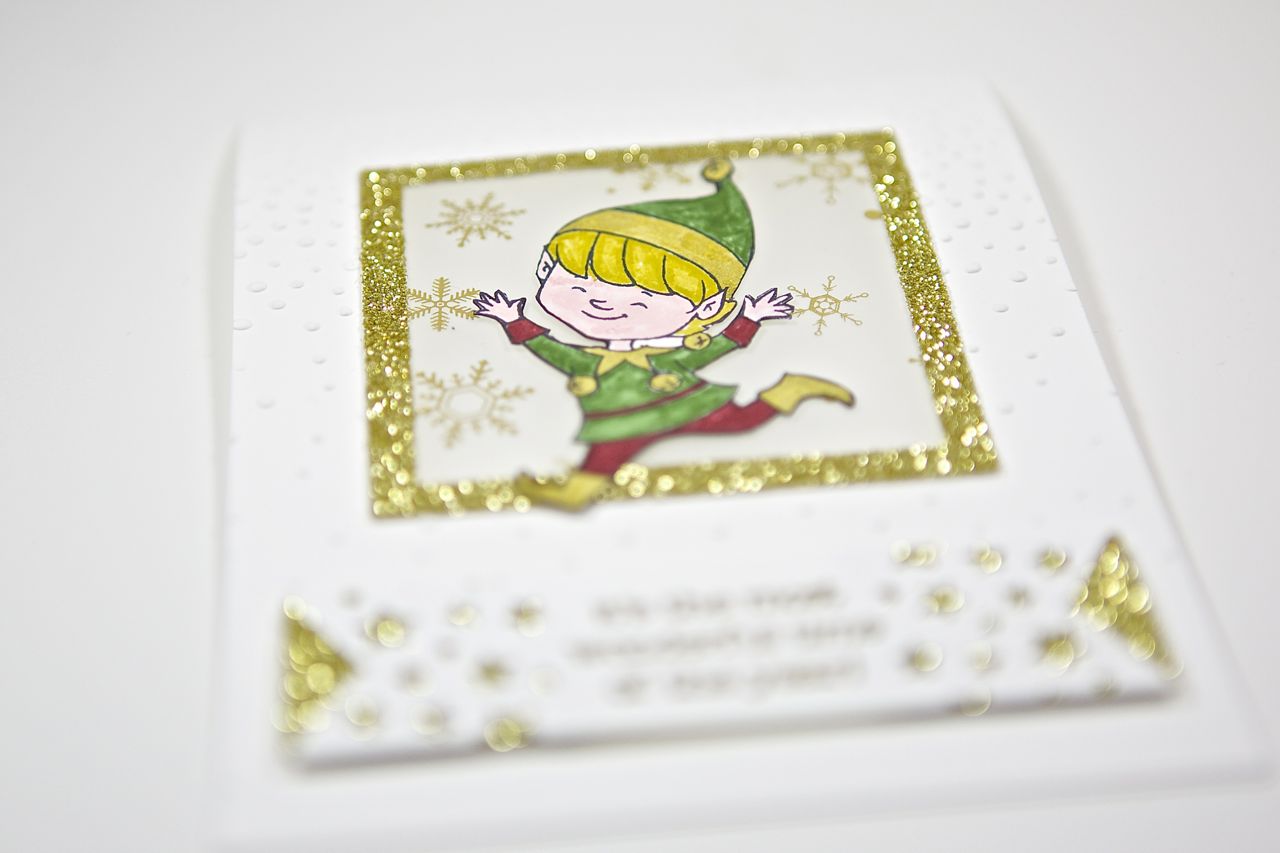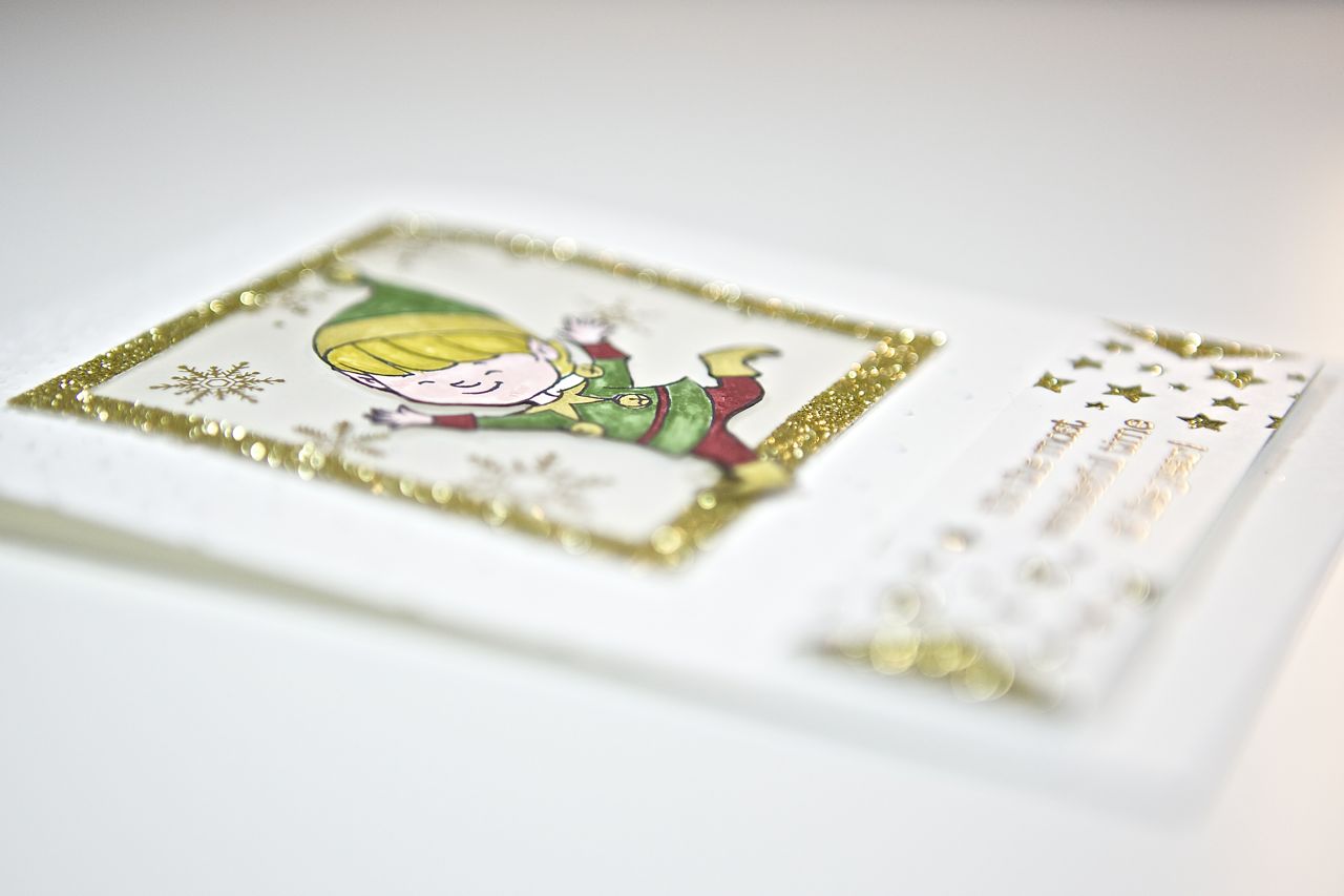 hier habe ich noch eine Weihnachtskarte für euch. Dafür habe ich den kleinen Elf aus dem Stempelset Christmas Cuties koloriert – mit den Markern und Wink of Stella Stiften – und aus dem Rahmen springen lassen 🙂