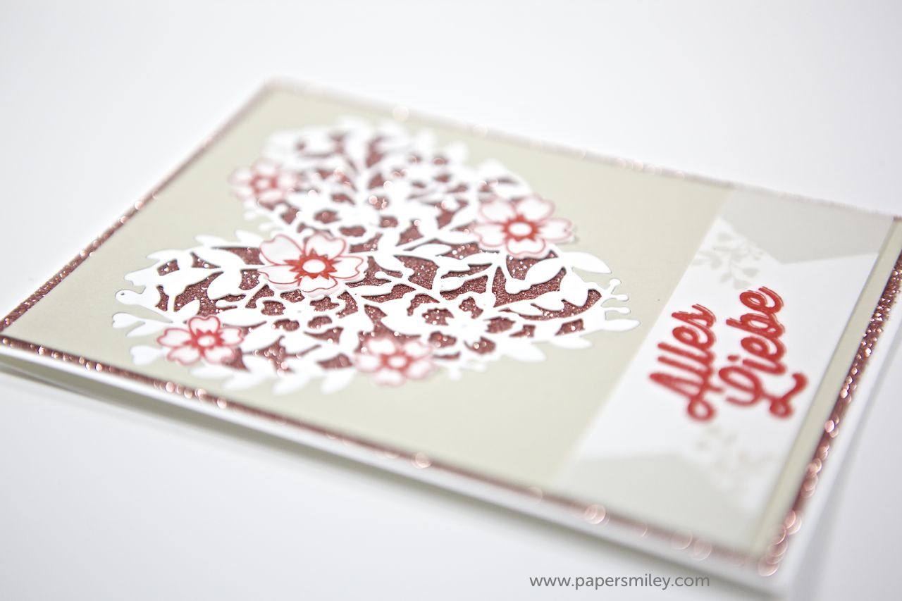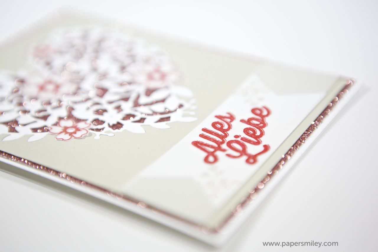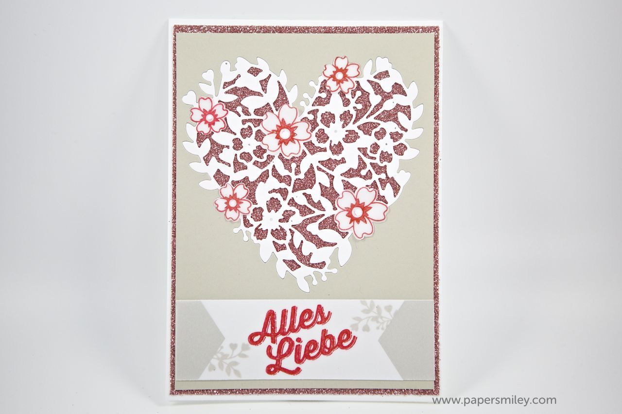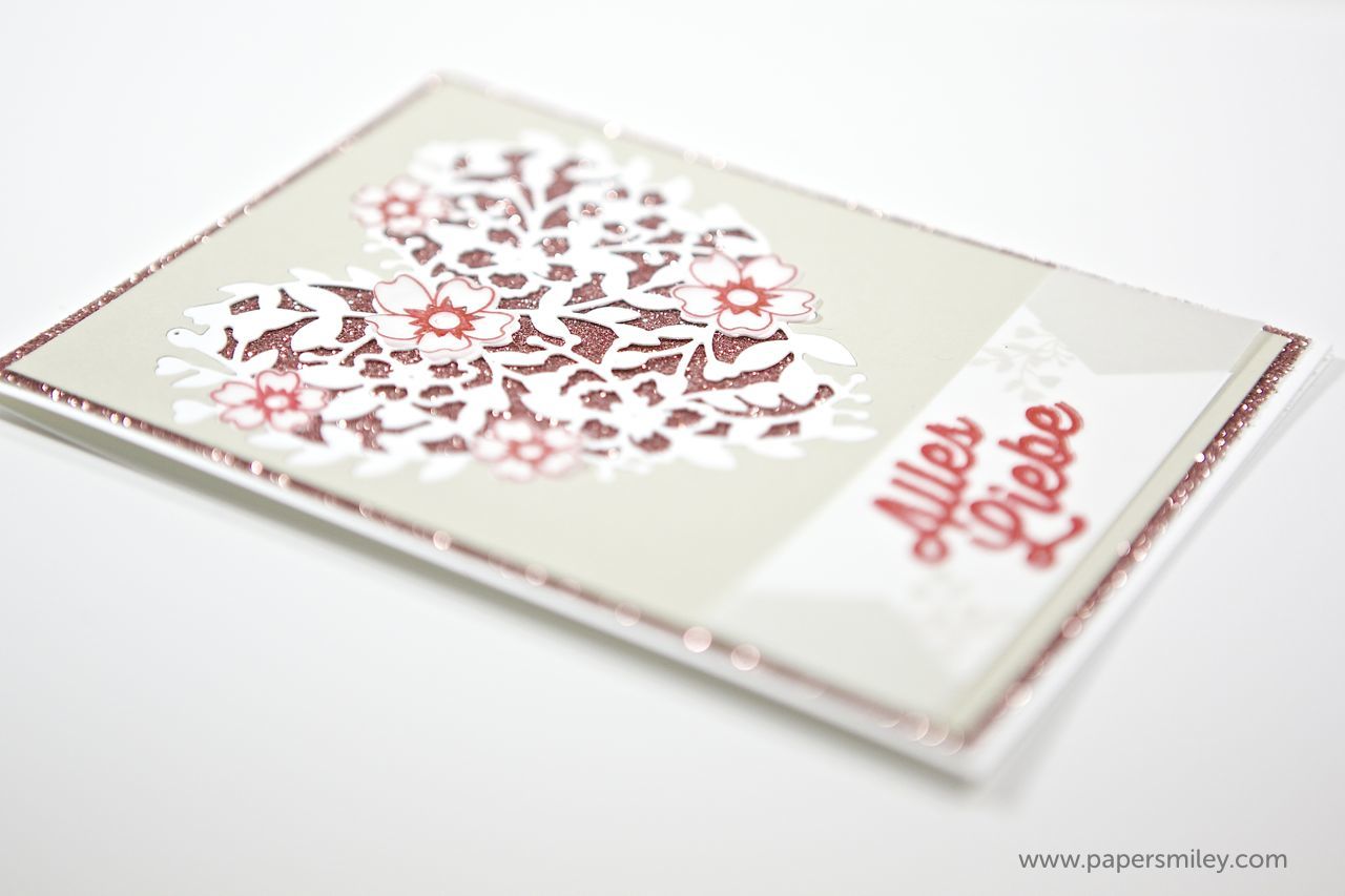 Das Herz ist aus Flüsterweiß ausgestanzt und in einen Rahmen aus Savanne eingesetzt. Die Blüten sind auf Pergamentpapier gestempelt und ausgestanzt. Dadurch wirken sie relativ leicht. Ein weiteres neues Produkt, das ich hier verwendet habe, ist das Glitzerpapier in Kirschblüte. Es ist auch leichter, als z.B. rotes Glitzerpapier, wenn auch nicht ganz so hell und leicht, wie ich es gerne hätte.