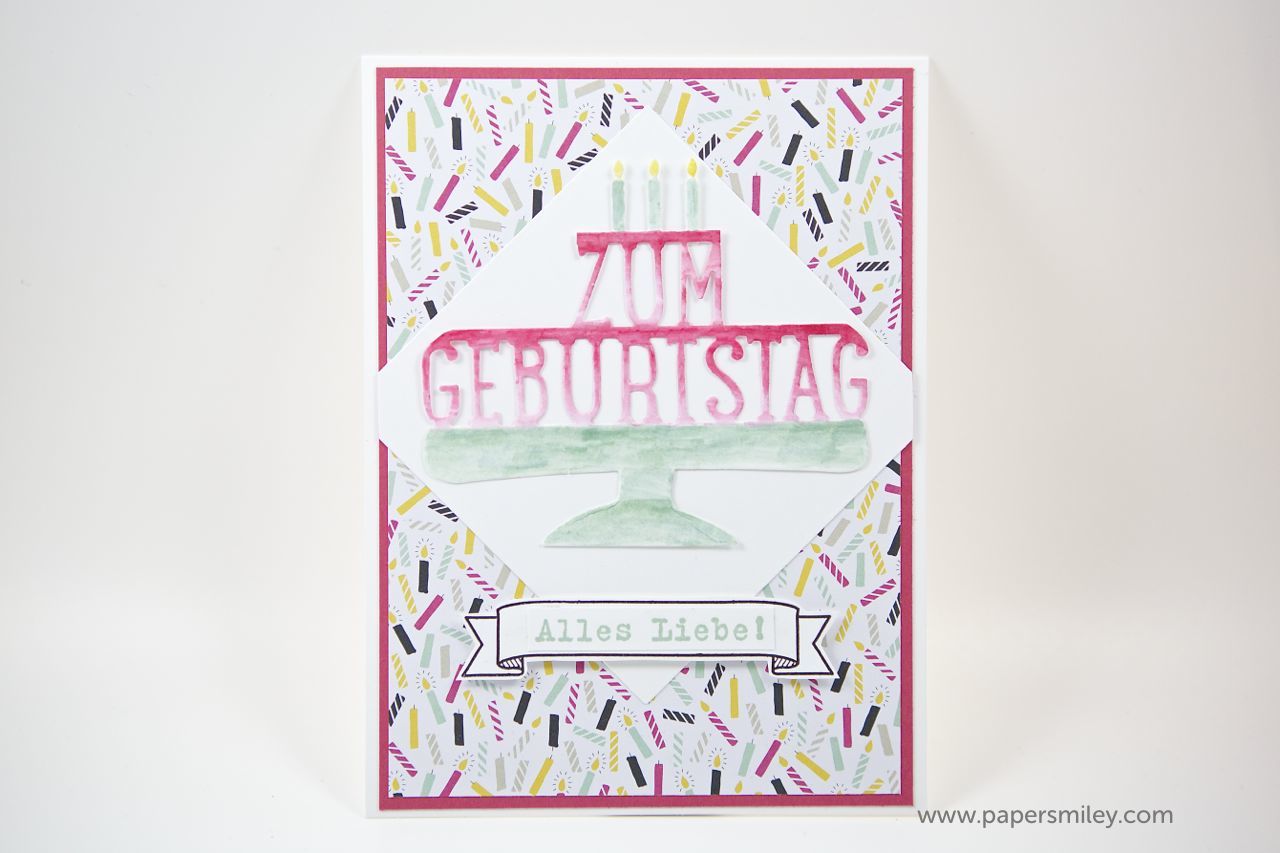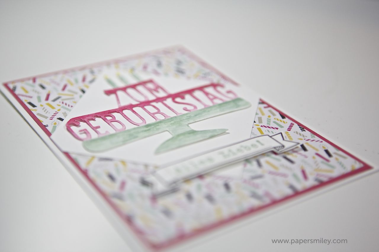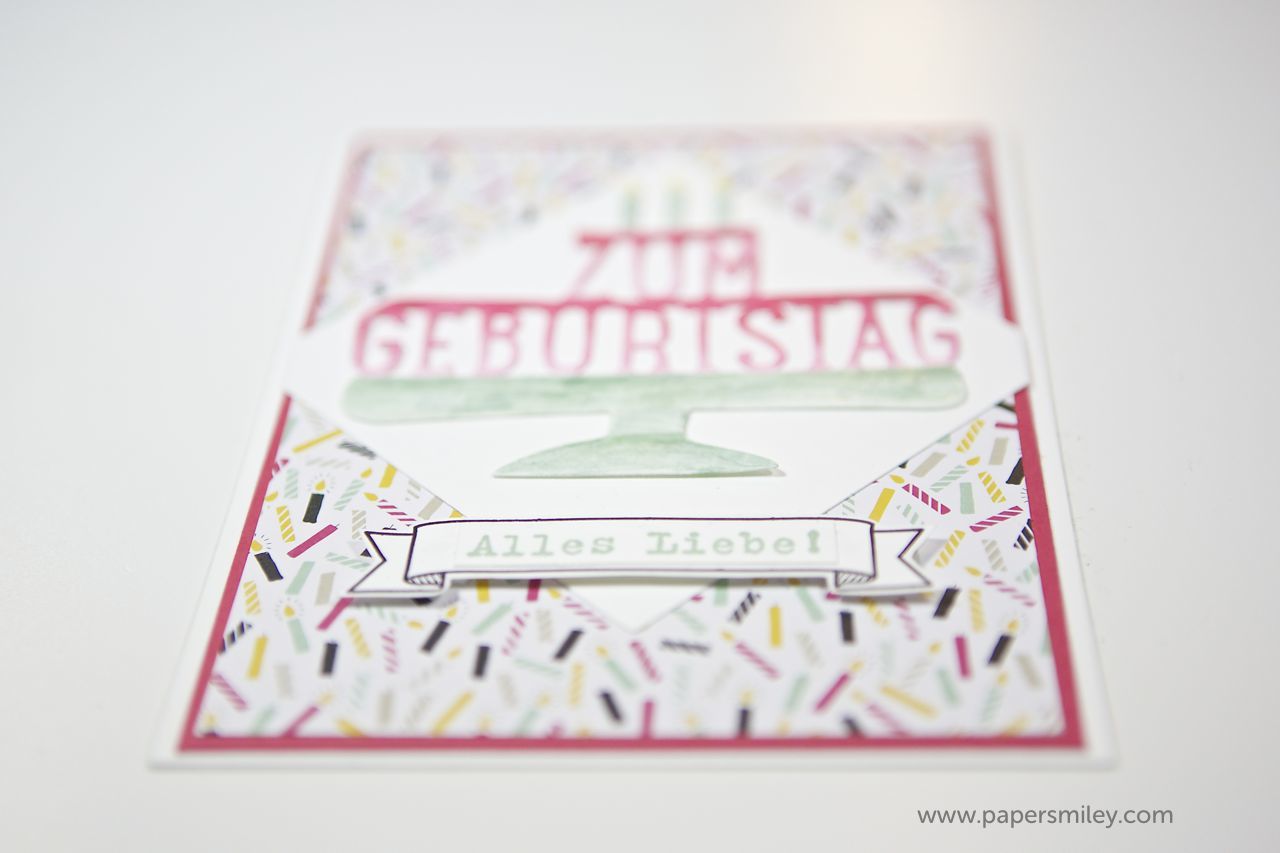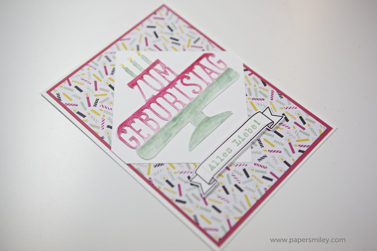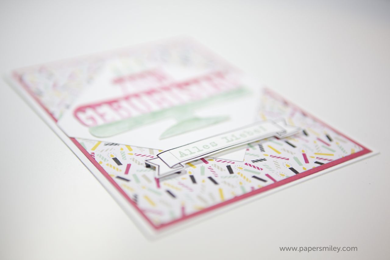 Das Designerpapier ist aus dem „Megablock“ Meine Party. Das ist ein 12 x 12 Zoll Block mit 48 Blatt. Der hat echt schöne Partymotive, wie hier den Kerzenhintergrund.