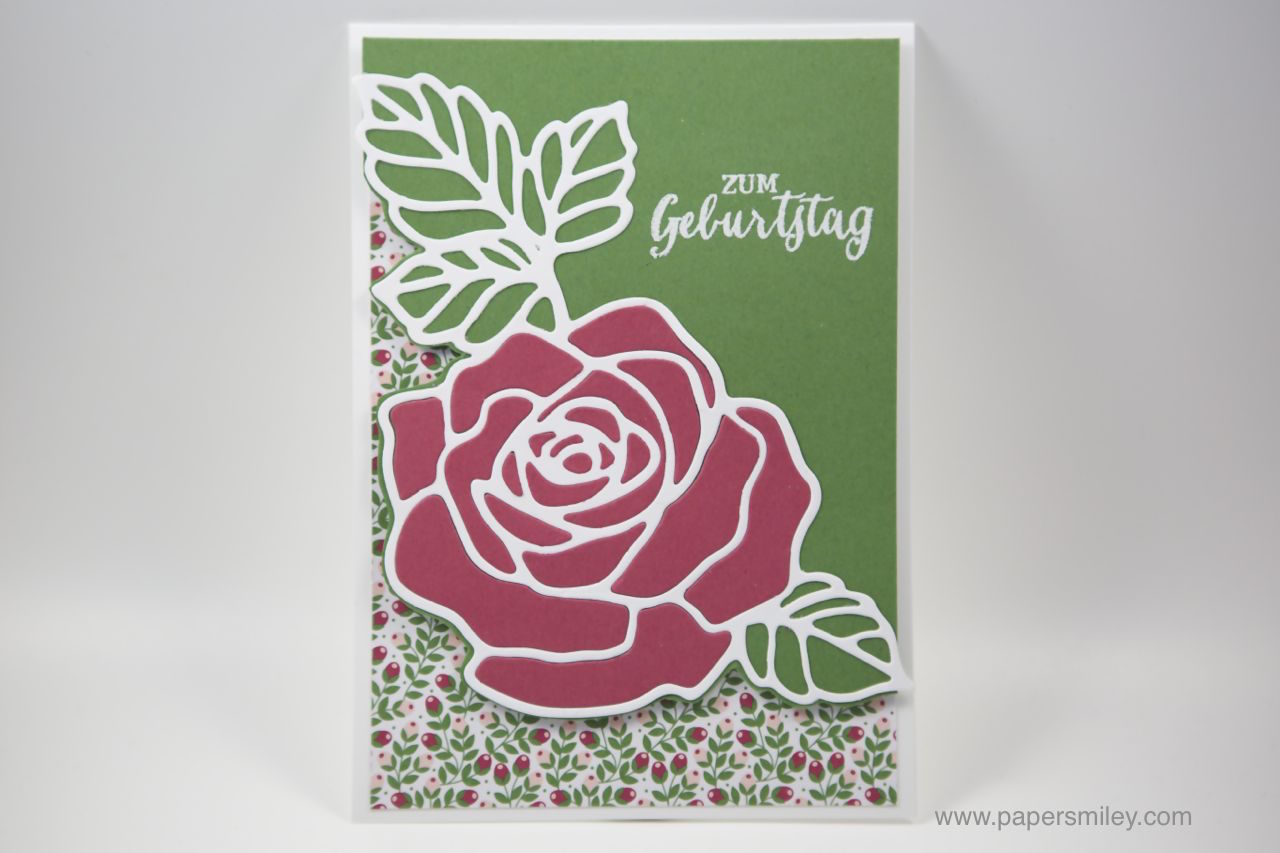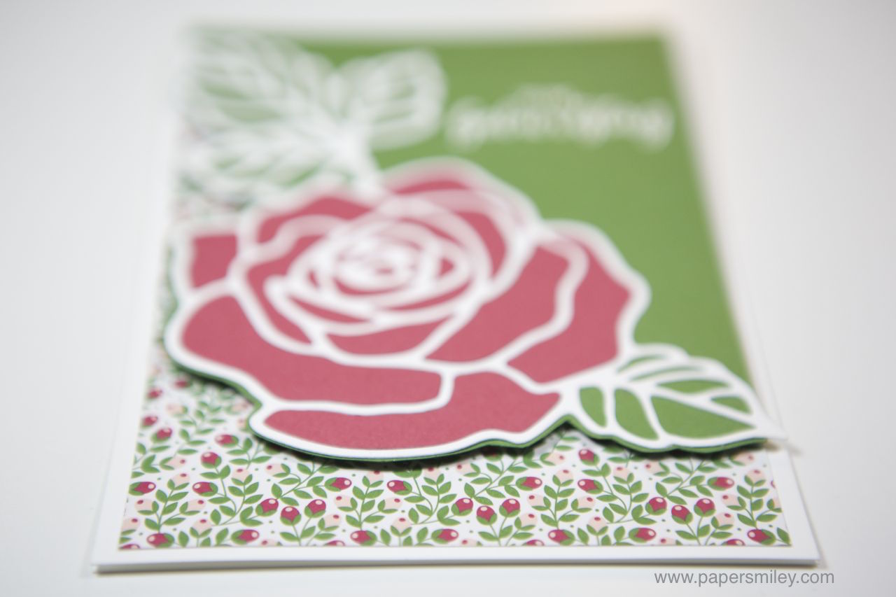 Die Hauptfarben sind heute Gartengrün und Rosenrot. Mit den Thinlits Formen Rosengarten habe ich eine weisse Rose ausgestanzt. Die wurde dann vor einen gartengrünen Hintergrund gesetzt.