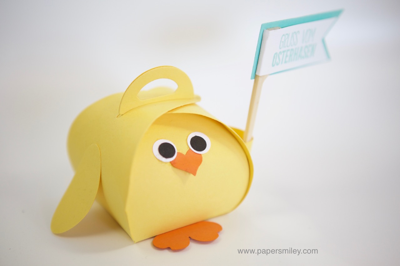 Diese kleinen Küken, die man so schön mit den Thinlits „Zierschachtel für Andenken“ werkeln kann, kennt ihr vermutlich schon. Ich wollte aber gerne noch einen Spruch dazu haben und habe daher meinem Kücken einfach eine kleine Fahne in die Hand (Flügel) gegeben.