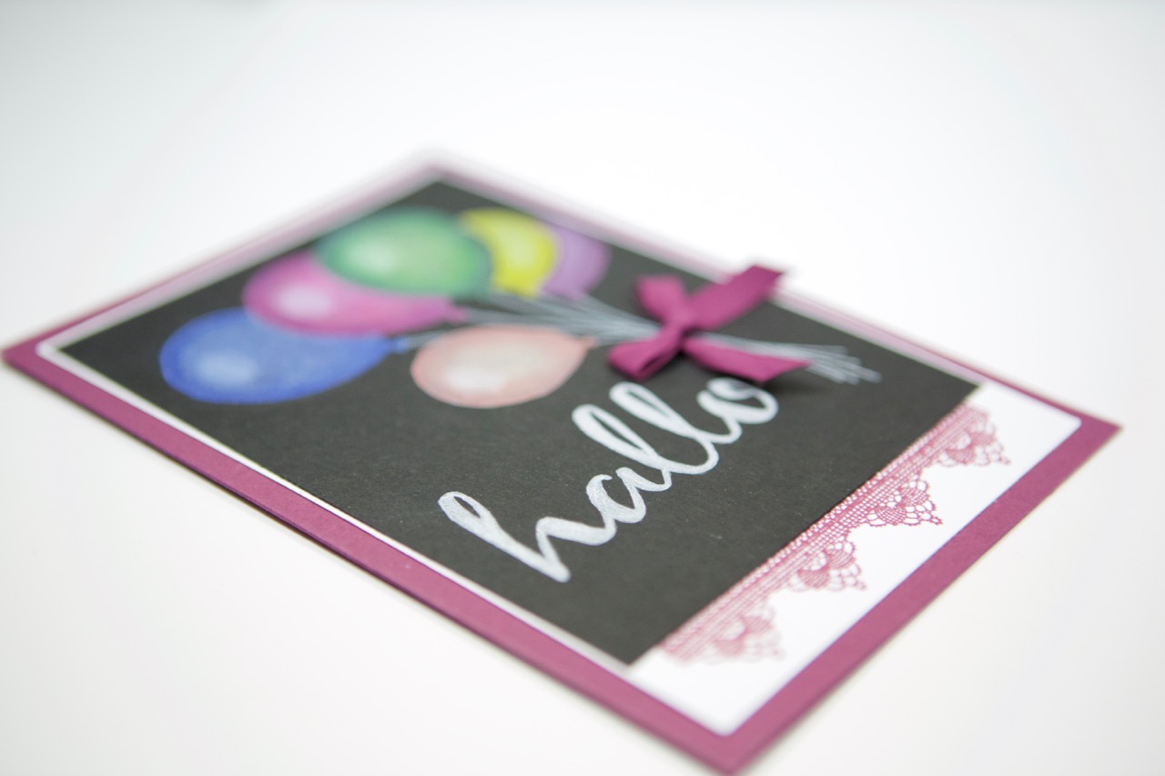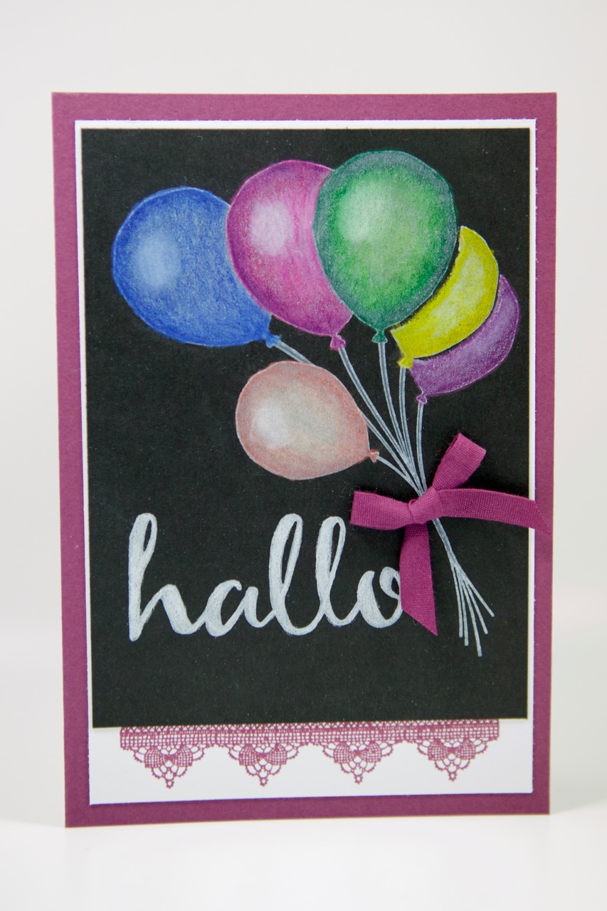 Hier ist eine versprochene weitere Karte mit der Farbe-auf-Schwarz-Technik. Diesmal mit dem Stempelset Partyballons und dem „hallo“ aus dem gleichnamigen Sale-A-Bration Stempelset.