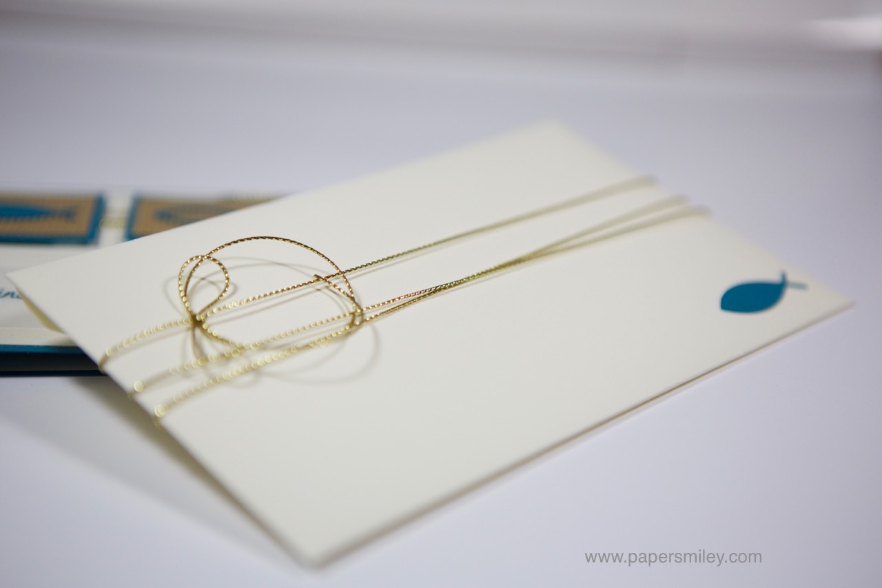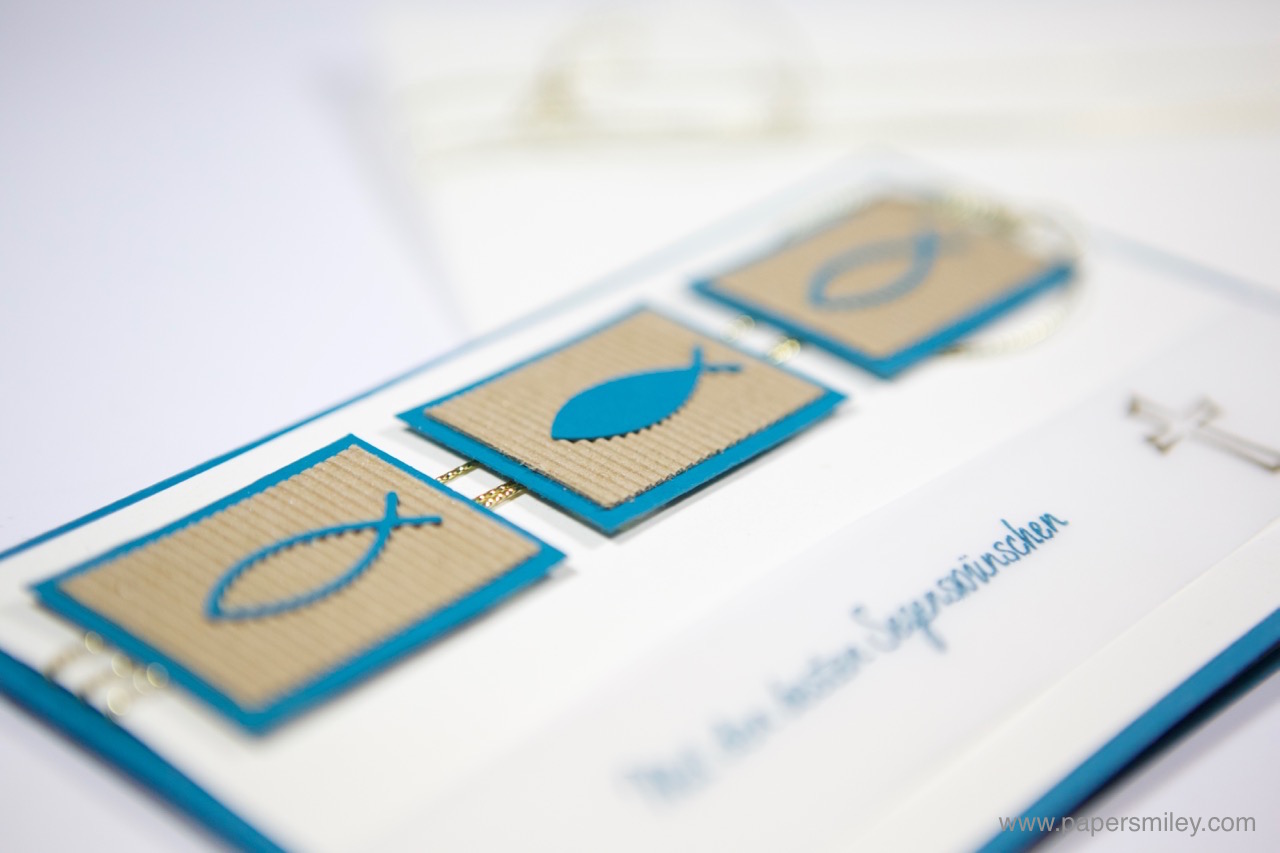 Hierfür habe ich mal wieder meine Silhouette bemüht, da ich wenig Stempel mit passenden Motiven habe. Die Fisch-Symbole sind mit der Silhouette ausgeschnitten. Montiert auf sandfarbener Wellpappe und einer Lage Cardstock in Petrol. Hinter den Bildchen ist die vanillefarbene Kartenfront mit goldener Kordelschnur (aus dem Stampin‘ Up! Weihnachtskatalog) umwickelt.