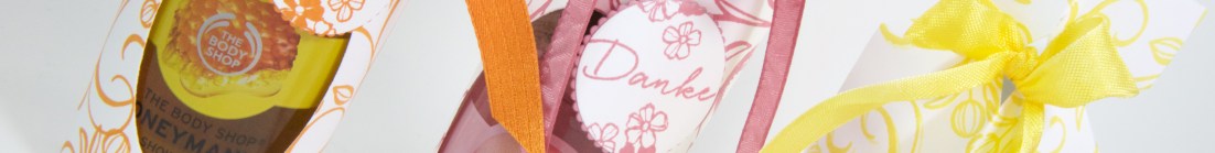 Heute geht es um kleine Mitbringsel. Oder Gastgeschenke. Ich habe hier kleine Duschgel-Fläschchen vom Body Shop verpackt. Die gibt es in unterschiedlichen Geschmacksrichtungen – und dazu natürlich in unterschiedlichen Farben.