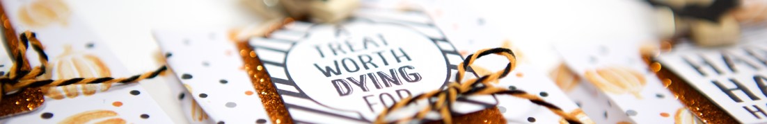 Die Etiketten sind mit dem Stempelset Sweet Hauntings und der Handstanze Etikettanhänger erstellt. Dann mit der Hand den weißen Rand abschneiden, damit das Glitzerpapier in Kürbisgelb (mit der gleichen Stanze ausgestanzt) einen Rand um das Etikett bildet.