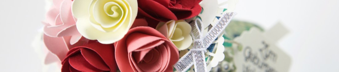 Oben drauf habe ich ein Mini-Zierdeckchen und darauf einen Rosenstrauß gesetzt. So sieht das ganze dann aus, wie ein Blumenstrauß in einer Vase.