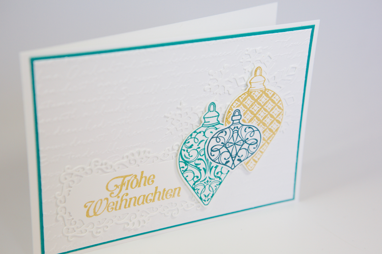 Heute gibt’s eine einfache Weihnachtskarte mit Weihnachtskugeln. Der Hintergrund ist mit der Prägeform Schreibschrift geprägt. Das gibt der Karte eine schöne Struktur.