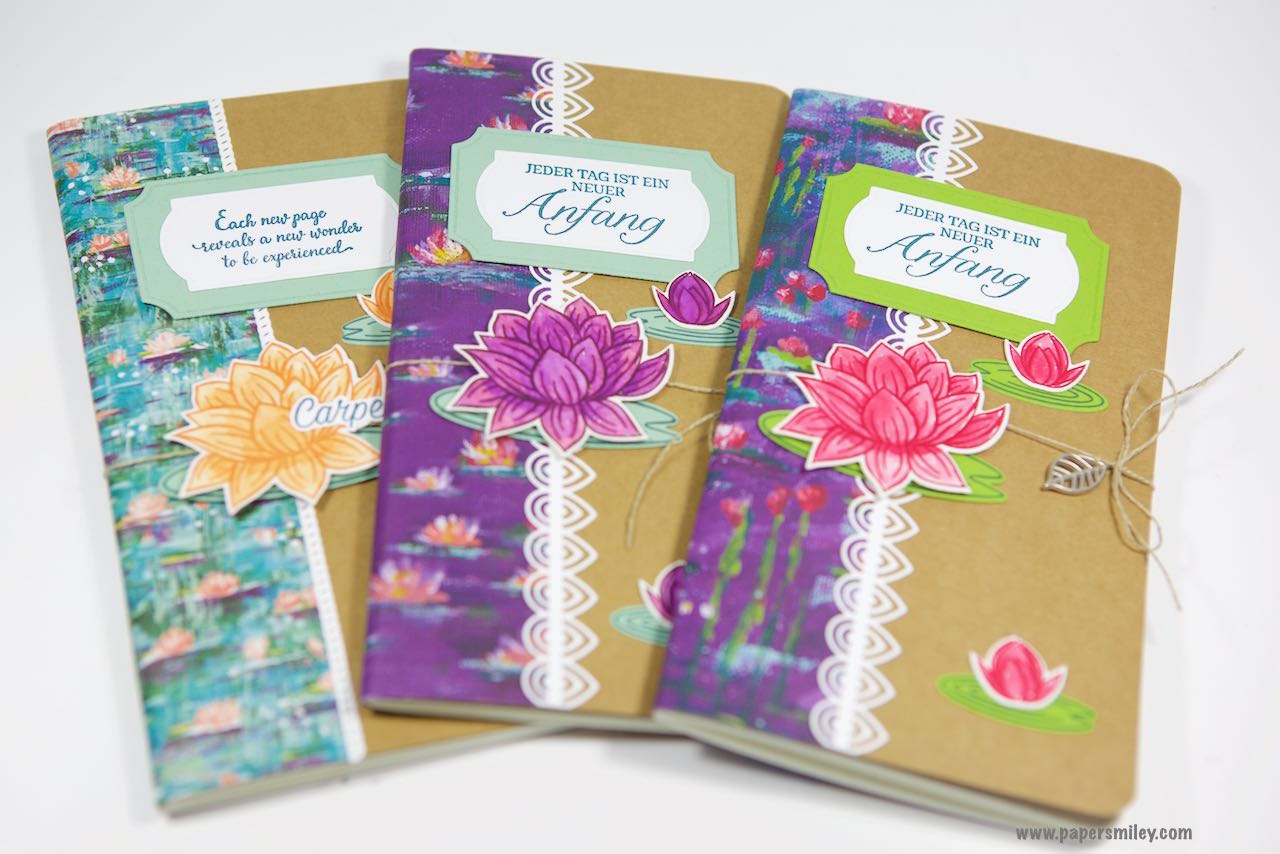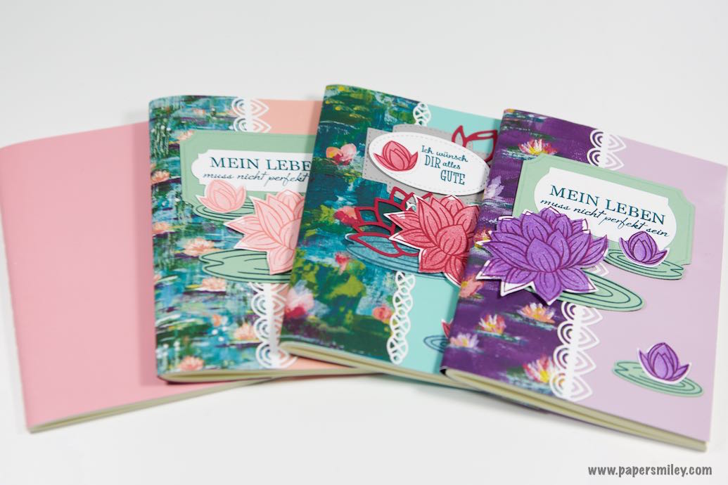 Dazu habe ich das Lovely Lily Pad Stempelset und die dazu passenden Stanzformen Seerose verwendet, um ein paar weitere Seerosen zu kreieren. Dazu habe ich die passenden Farbekombinationen Wassermelone + Grüner Apfel, sowie Brombeermousse + Minzmakrone und Grapefruit + Minzmakrone verwendet. Die Blüten sind wasserkoloriert (mit Wassertankpinsel). Geschlossen sind die Heftchen mit Leinenband.