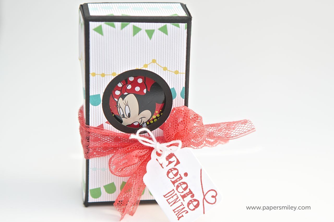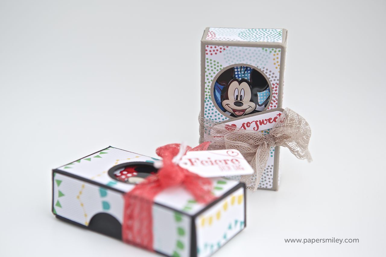 ok, erstmal keine weitere Weihnachtskarte, sondern eine Verpackung. Ich habe hier kleine Verpackung für die süßen Micky und Minnie Schoko-Boxen gebastelt. Damit man den Inhalt erahnen kann, gibts ein kleines Fensterchen, aus dem Micky und Minnie rausschauen. 🙂