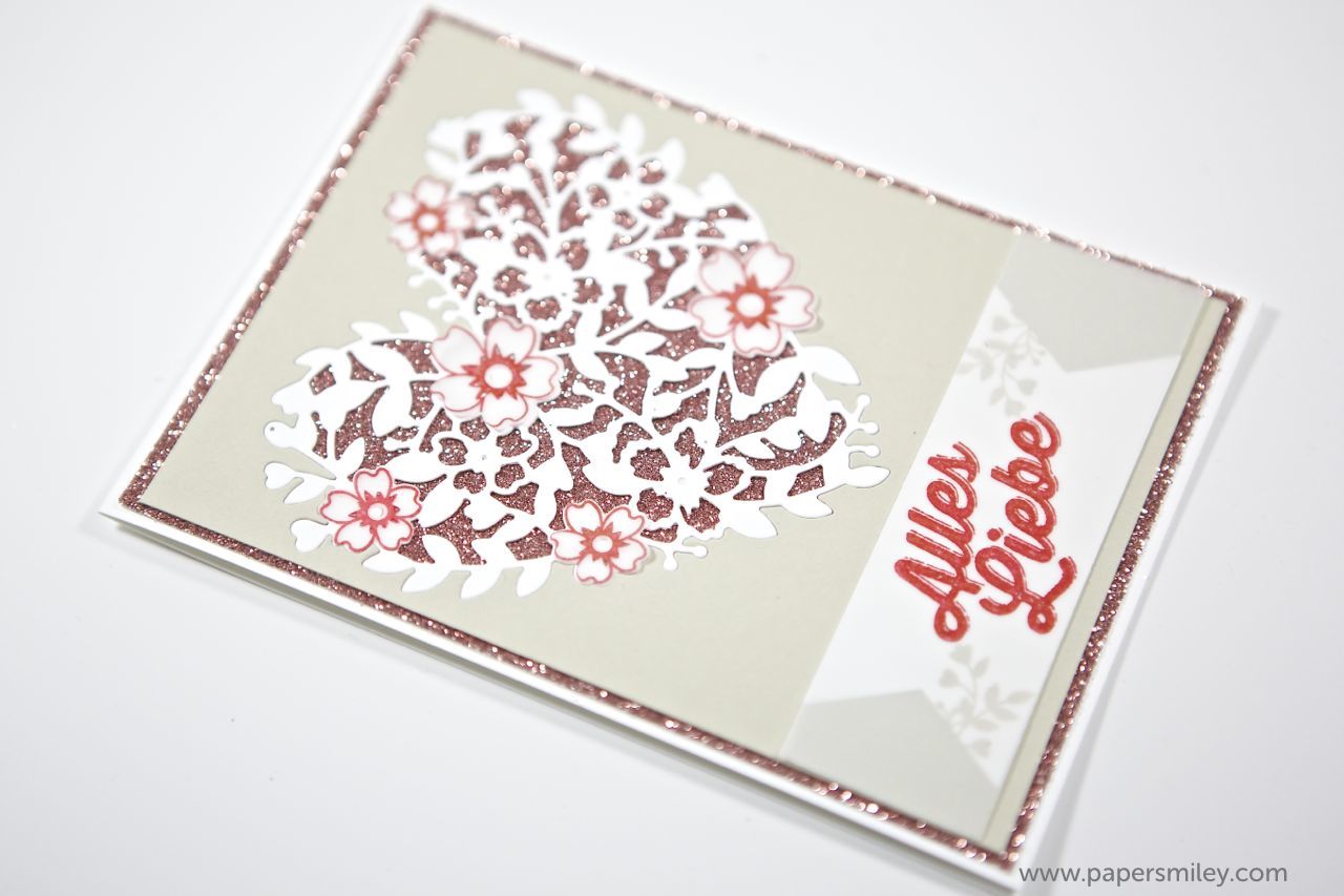 heute habe ich eine schlichte Hochzeitskarte für euch. Dafür habe ich das Blütenherz ganz einfach einmal in Pergamentpapier ausgestanzt, einmal aus weissem Cardstock „herausgestanzt“ und dann das Pergament-Herz eingesetzt. Es ist natürlich immer ein bisschen schwierig, das festzukleben, ohne dass man es sieht. Die Klebestellen sind einfach hinter den Blüten.
