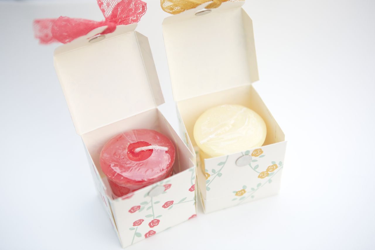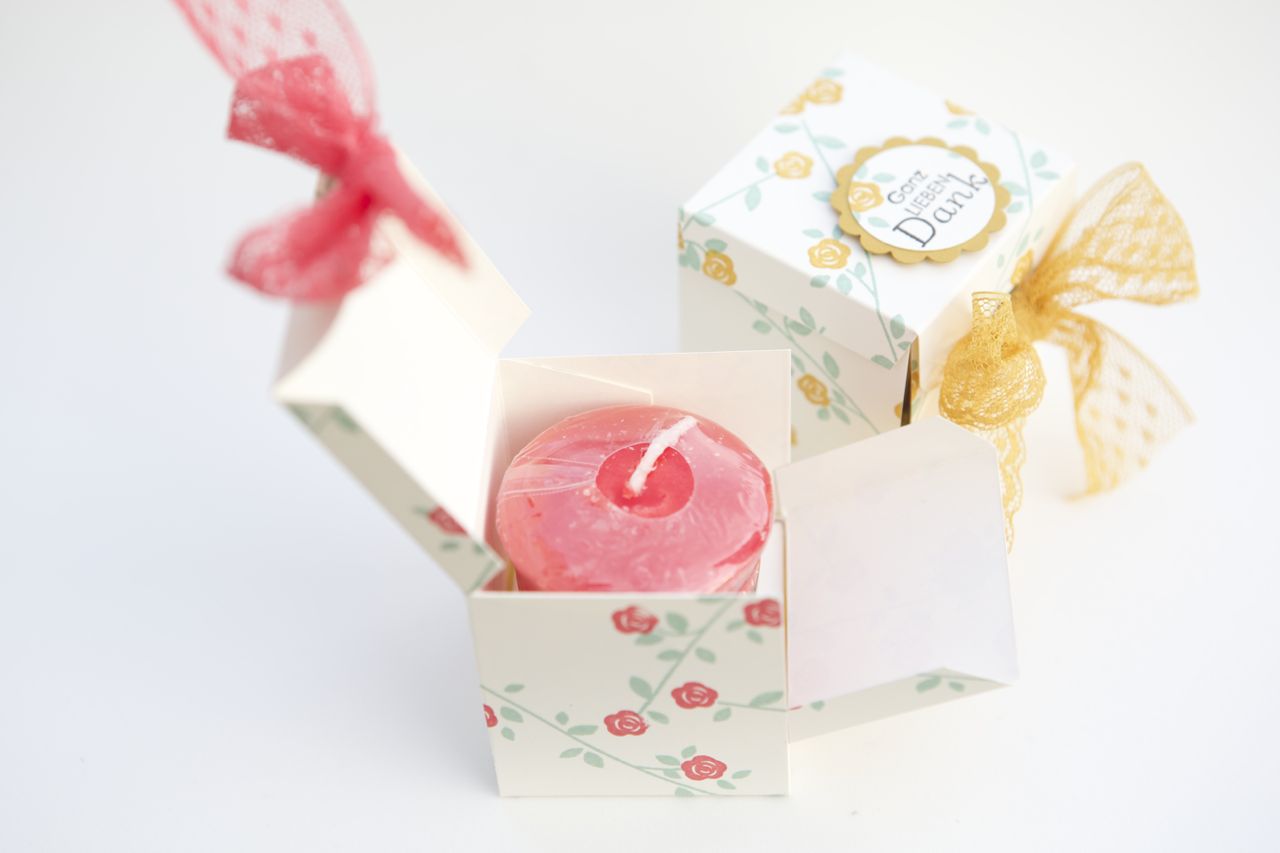 Die fertigen Verpackungen sind 5x5x5,5 cm (LxBxH) groß. Die Kerzen stehen in einem kleinen Halter, damit sie nicht herumrutschen in den Boxen. Verschlossen werden sie mit Magneten. Die obere Lasche ist mit der Gewellte-Anhänger-Stanze geformt. Zusätzlich zum Deckel, kann man auch einen Teil der Vorderseite nach vorne klappen, dadurch sind die Kerzen schön sichtbar.