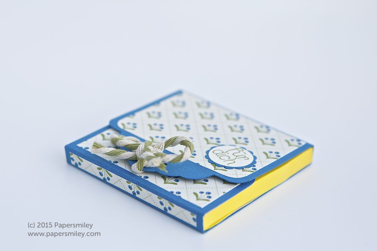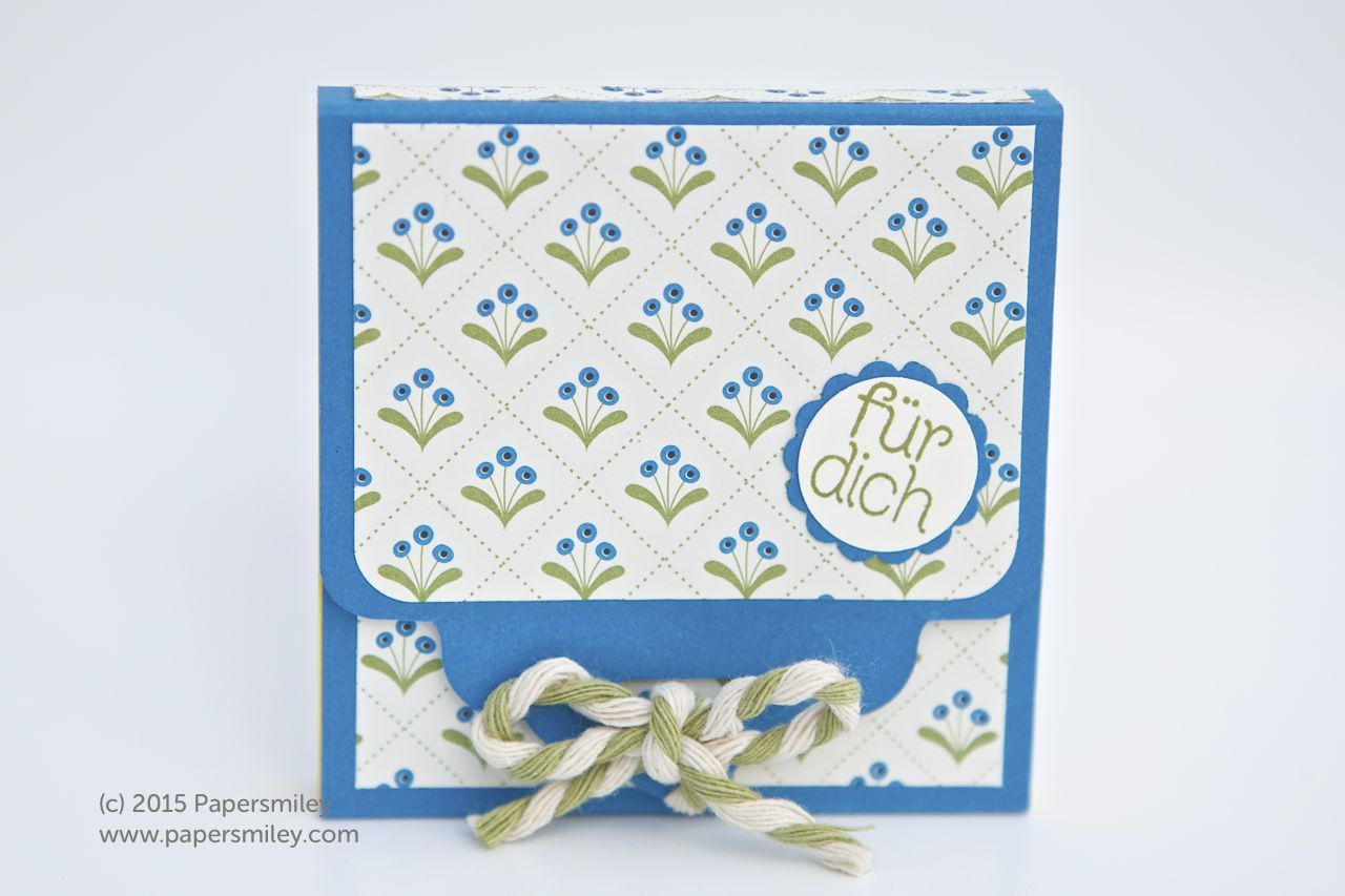 Und damit die kleinen Blätter nicht in der Tasche verknicken, muss man sie einpacken. Natürlich. Ich habe hier pazifikblauen Cardstock verwendet. Den benutze ich nicht oft, aber zu diesem DSP hat er super gepasst. Die Kombination sieht einfach süß aus.