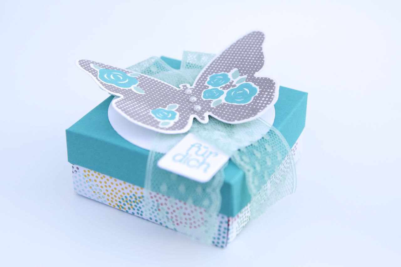 Die Verpackung selbst habe ich mit dem Stanz- und Falzbrett für Geschenkschachteln erstellt. Mittlerweile führt Stampin Up! ja drei verschiedene Falzbretter. Eins für Umschläge – das ist für mich ein Must-have, da kann man schnell einen Umschlag für jede benötigte Kartengröße herstellen. Dann gibt es ein neues Stanz- und Falzbrett für Geschenktüten – ist auch nett, die kann man aber auch gut nur z.B. mit dem Papierschneider von Stampin Up! (auch ein Must-have) herstellen.