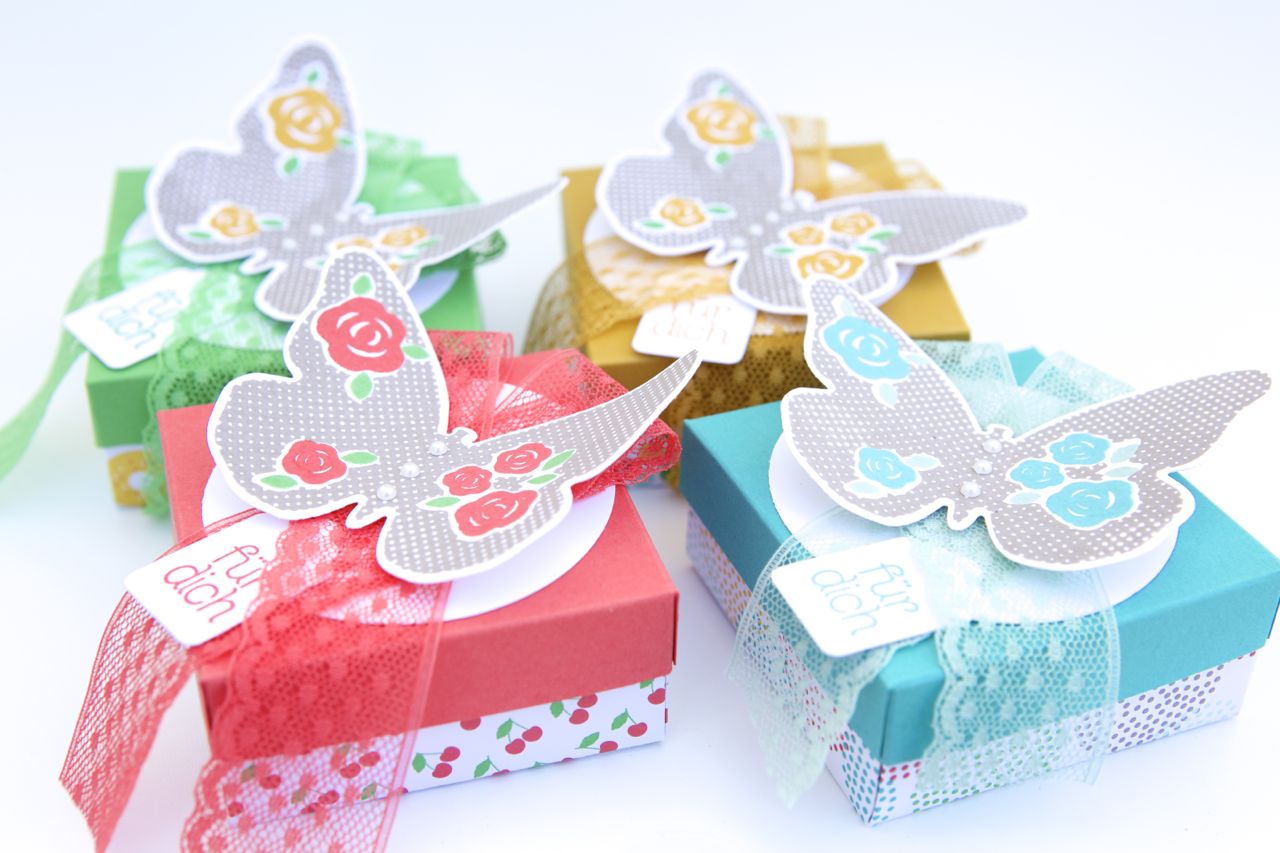 heute geht’s wieder um eine Verpackung, diesmal für Lindt Schokolade. Natürlich wieder mit Schmetterlingen. Das ist momentan mein Lieblingsmotiv und Stampin Up! bietet da auch gerade eine Menge Stempel und Stanzen mit denen man eine Menge Spaß haben kann 🙂