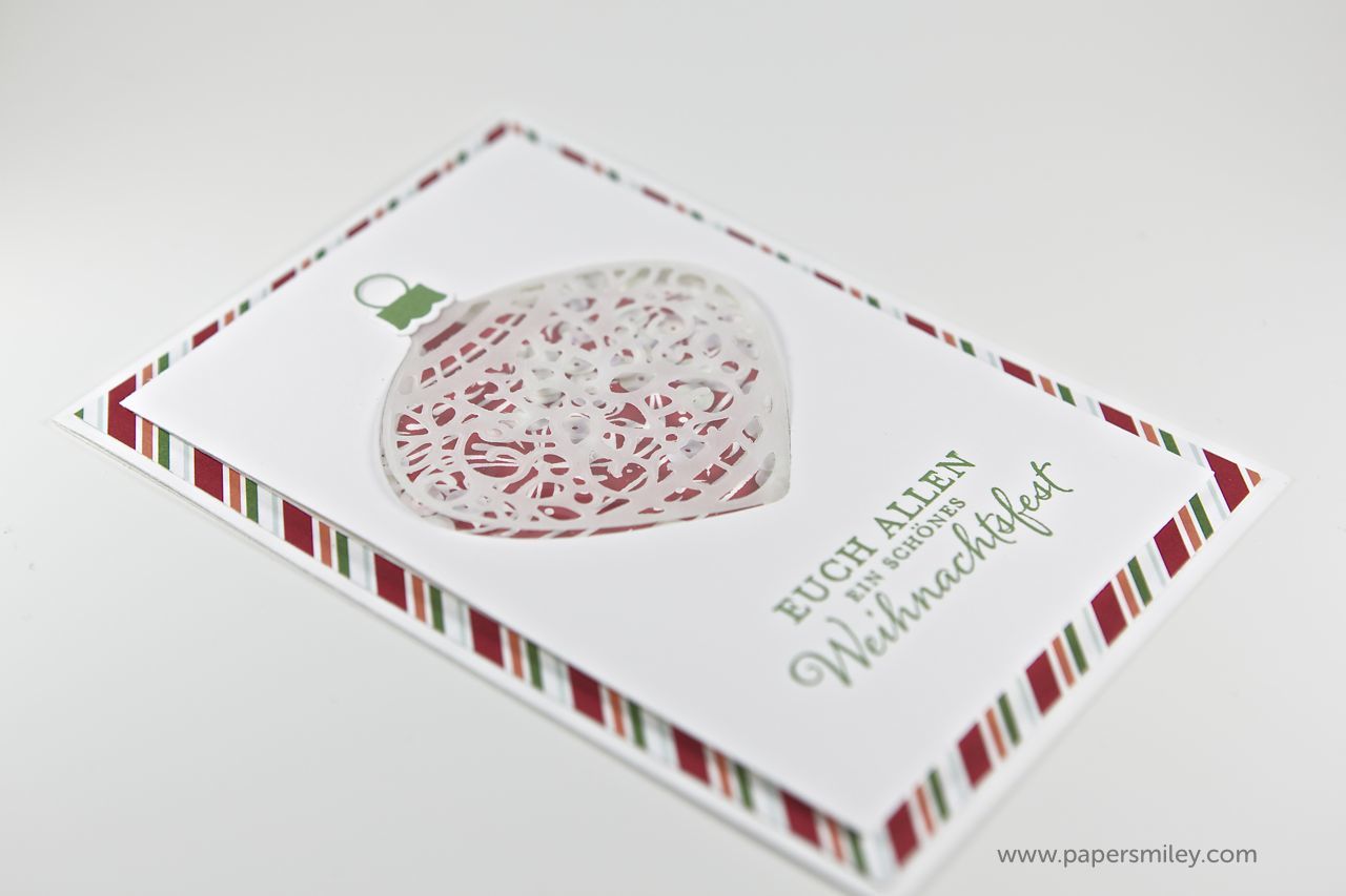 Weihnachtskugel-Schüttelkarte mit Stampin' Up!hier nochmal eine Karte mit dem Stempelset Zauberhafte Zierde und den Thinlits Formen am Christbaum. Diesmal aber als versteckte Schüttelkarte.